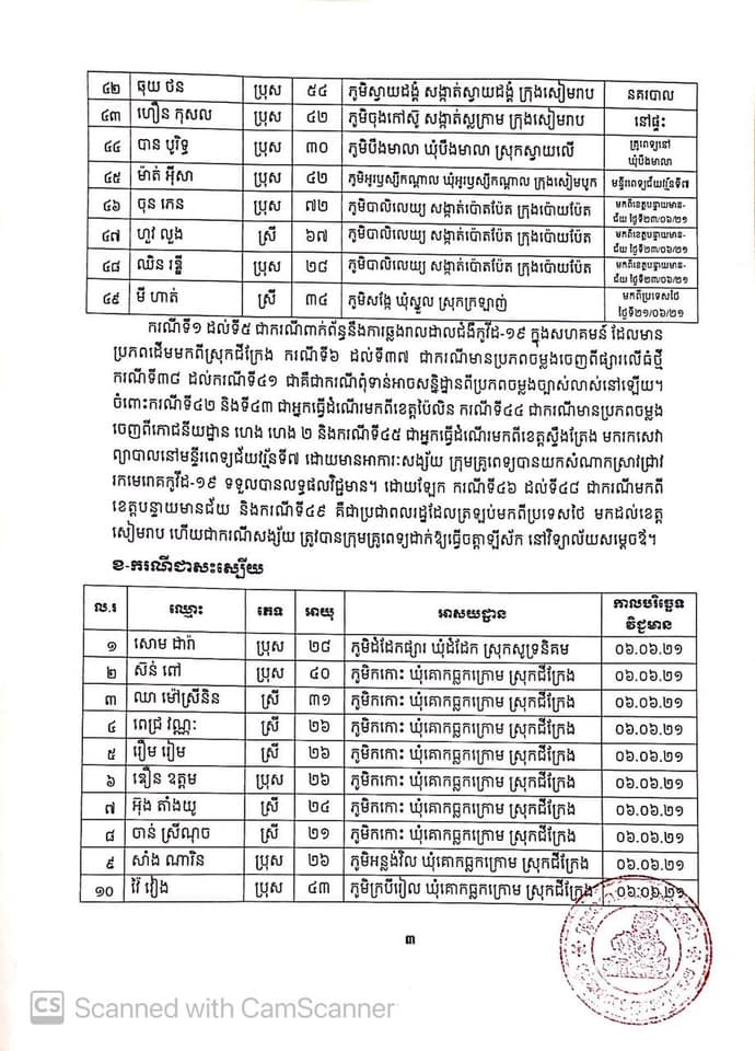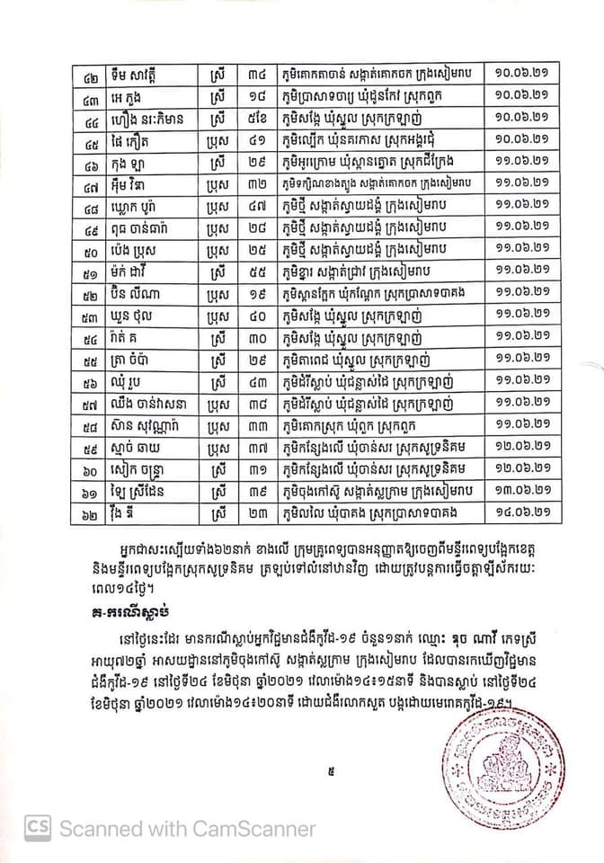សូមបញ្ជាក់ផងដែរថា មកទល់ពេលនេះ ខេត្តសៀមរាប មានអ្នកវិជ្ជមានជំងឺកូវីដ-១៩ ចំនួន ៧៥១នាក់។ ក្នុងនោះបានព្យាបាលជាសះស្បេីយចំនួន ២៦៧នាក់ ស្លាប់៩នាក់ និង៤៧៥នាក់ កំពុងសម្រាកព្យាបាលនៅមន្ទីរពេទ្យបង្អែកខេត្តសៀមរាប មណ្ឌលចត្តាឡីស័កគរុកោសល្យ និងវិក្រឹតការខេត្ត និងវិទ្យាល័យដំដែក ៕