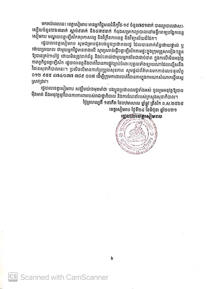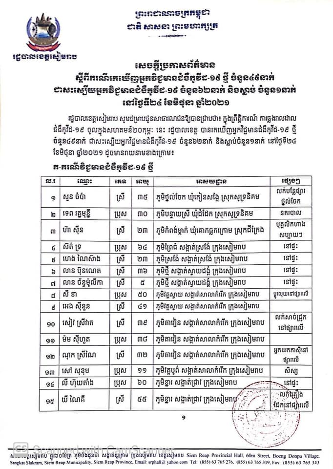 ខេត្តសៀមរាប៖ យោងតាមការចុះផ្សាយរបស់ មន្ទីរព័ត៌មានខេត្តសៀមរាប បានឲ្យដឹងថា អ្នកវិជ្ជមានជំងឺកូវីដ-១៩ ចំនួន៣២នាក់ ក្នុងចំណោមអ្នកវិជ្ជមានជំងឺកូវីដ-១៩ ចំនួន៤៩នាក់ ដែលរដ្ឋបាលខេត្តសៀមរាប ប្រកាសរកឃើញនៅថ្ងៃទី២៤ ខែមិថុនានេះ គឺមានប្រភពចម្លងចេញពីផ្សារលើធំថ្មី ស្ថិតក្នុងក្រុងសៀមរាប សូមចូលរួមអនុវត្តនូវវិធានការរបស់រាជរដ្ឋាភិបាល គឺ ៣ការពារ និង៣កុំ ឲ្យបានខ្ជាប់ខ្ជួន។