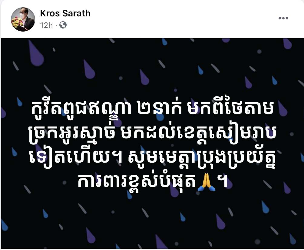 យោងតាមការបញ្ជាក់នៅលើគណនីហ្វេសប៊ុករបស់ លោកវេជ្ជបណ្ឌិត ក្រុស សារ៉ាត់ ដែលជាប្រធានមន្ទីរសុខាភិបាលខេត្តសៀមរាប បានឲ្យដឹងថា រកឃើញករណី “កូវីដពូជឥណ្ឌា (Delta) ២នាក់ មកពីថៃតាមច្រកអូរស្មាច់ មកដល់ខេត្តសៀមរាប ទៀតហើយ។ សូមមេត្តាប្រុងប្រយ័ត្នការពារខ្ពស់បំផុត🙏”។