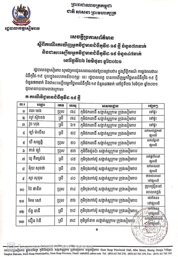 សូមបញ្ជាក់ផងដែរថា មកទល់ពេលនេះ ខេត្តសៀមរាប មានអ្នកវិជ្ជមានជំងឺកូវីដ-១៩ សរុបចំនួន ៨៨១នាក់, បានព្យាបាលជាសះស្បើយចំនួន ៣២០នាក់, ស្លាប់ ៩នាក់ និង៥៥២នាក់ កំពុងសម្រាកព្យាបាលនៅមន្ទីរពេទ្យបង្អែកខេត្តសៀមរាប មណ្ឌលចត្តាឡីស័កគរុកោសល្យ និងវិក្រឹតការខេត្ត និងវិទ្យាល័យដំដែក។