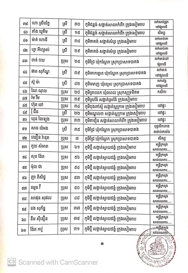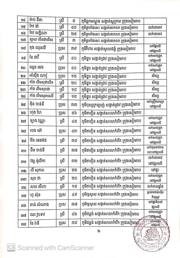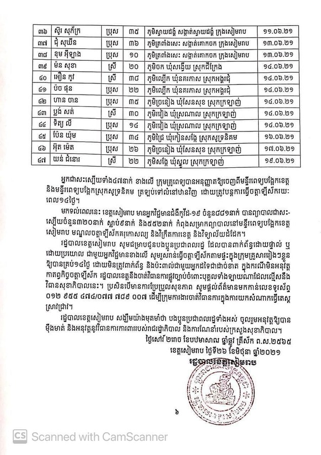 រដ្ឋបាលខេត្តសៀមរាប បន្តអំពាវនាវដល់ប្រជាពលរដ្ឋ ដែលបានពាក់ព័ន្ធដោយផ្ទាល់ ឬដោយប្រយោល ជាមួយអ្នកវិជ្ជមានខាងលើ ត្រូវរួសរាន់ធ្វើចត្តាឡីស័ក នៅតាមផ្ទះក្នុងក្រុមគ្រួសាររៀងៗខ្លួនឱ្យបានគ្រប់១៤ថ្ងៃ ដោយមិនត្រូវពាក់ព័ន្ធ និងប៉ះពាល់ជាមួយអ្នកដទៃជាដាច់ខាត។ ក្នុងករណីមិនអនុវត្តកាតព្វកិច្ចចត្តាឡីស័ក រដ្ឋបាលខេត្តនឹងចាត់វិធានការផ្លូវច្បាប់ចំពោះបុគ្គលទាំងឡាយណាដែលលើ្មសនឹងវិធានសុខាភិបាលនេះ។ ប្រសិនបើមានការប្រែប្រួលសុខភាព សូមផ្តល់ព័ត៌មានមកកាន់លេខទូរស័ព្ទ០១២ ៩៥៥ ៤៧៤/០៧៧ ៧៨៩ ០០៧ ដើម្បីក្រុមការងារចាត់វិធានការក្នុងការយកសំណាកធ្វើតេស្តស្រាវជ្រាវ៕