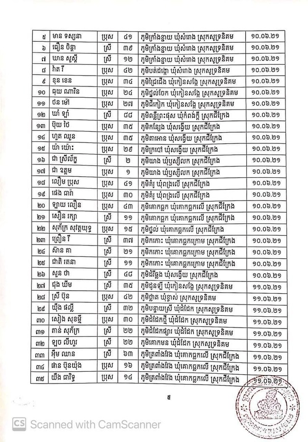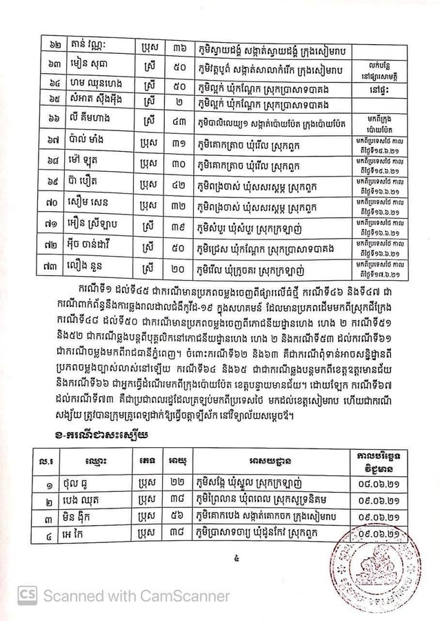 ដោយឡែក ករណីទី៦៧ ដល់ករណីទី៧៣ គឺជាប្រជាពលរដ្ឋដែលត្រឡប់មកពីប្រទេសថៃ មកដល់ខេត្តសៀមរាប ហើយជាករណីសង្ស័យ ត្រូវបានក្រុមគ្រូពេទ្យដាក់ឱ្យធ្វើចត្តាឡីស័ក នៅវិទ្យាល័យសម្ដេចឪ។