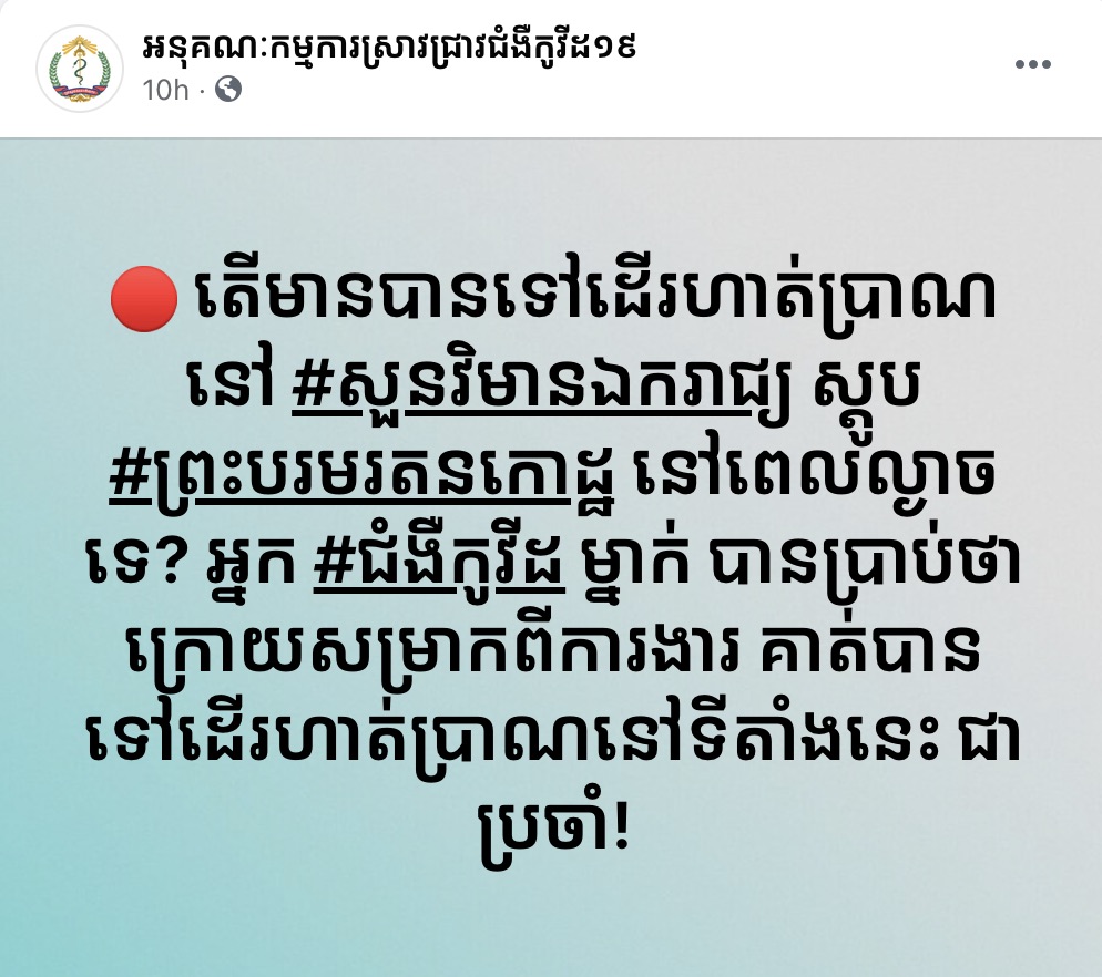 យោងតាមការបញ្ជាក់ពី អនុគណៈកម្មការស្រាវជ្រាវជំងឺកូវីដ១៩ បានឲ្យដឹងថា  “តើមានបានទៅដើរហាត់ប្រាណ នៅសួនវិមានឯករាជ្យ ស្តូបព្រះបរមរតនកោដ្ឋ នៅពេលល្ងាចទេ? អ្នកជំងឺកូវីដម្នាក់ បានប្រាប់ថា ក្រោយសម្រាកពីការងារ គាត់បានទៅដើរហាត់ប្រាណនៅទីតាំងនេះ ជាប្រចាំ!”