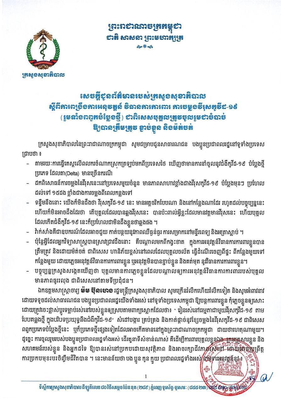 នៅមុននេះបន្តិចក្រសួងសុខាភិបាលបានចេញសេចក្តីជូនព័ត៌មានមួយស្តីពីការរកឃើញករណីនាំចូលជំងឺកូវីដ-១៩ ប្រភេទ Delta ជាច្រើនករណីលើពលករចំណាកស្រុកមកពីប្រទេសថៃ ហើយក្នុងនោះក្រសួងបានសង្កត់ធ្ងន់ថា វីរុសនេះ មានភាពសាហាវខ្លាំងជាងវីរុសកូវីដ-១៩ បំប្លែងមុនៗ ប្រហែល១៥ដងឯណោះ។