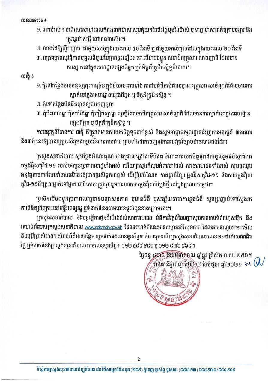 ក្នុងនោះដែរក្រសួងសុខាភិបាល បានទទូចដល់សាធារណជន មានការប្រុងប្រយ័ត្នខ្ពស់ ដោយសារតែសង្កេតឃើញថា បុគ្គលមួយចំនួនមានការភ្លេចខ្លួនដែលបណ្តាលអោយវិធានការការពាររបស់ពួកគាត់មានភាពធូររលុង ជាពិសេសនៅតាមទីប្រជុំជន។ សូមអានសេចក្តីប្រកាសព័ត៌មានខាងក្រោម៖