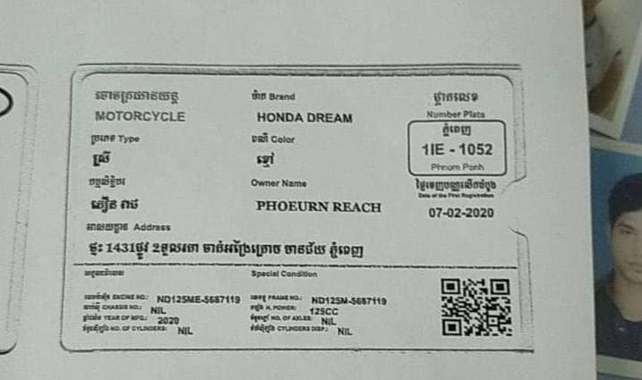 ម៉ូតូដែលចោរលួចយកទៅបាត់នោះ ម៉ាកហុងដាឌ្រីម ពណ៌ខ្មៅ ស៊េរីឆ្នាំ២០២០ ពាក់ស្លាកលេខភ្នំពេញ 1IE-1052 ជារបស់ជនរងគ្រោះ ឈ្មោះ ភឿន រាជ ភេទប្រុស អាយុ២៤ឆ្នាំ មានទីលំនៅផ្ទះលេខ១៤៣១ ផ្លូវជាតិលេខ២ ភូមិទួលរកា១ សង្កាត់ចាក់អង្រែក្រោម ខណ្ឌមានជ័យ រាជធានីភ្នំពេញ មុខរបររត់កង់បីដឹកព្រះសង្ឃ, លក់គោដុត ។