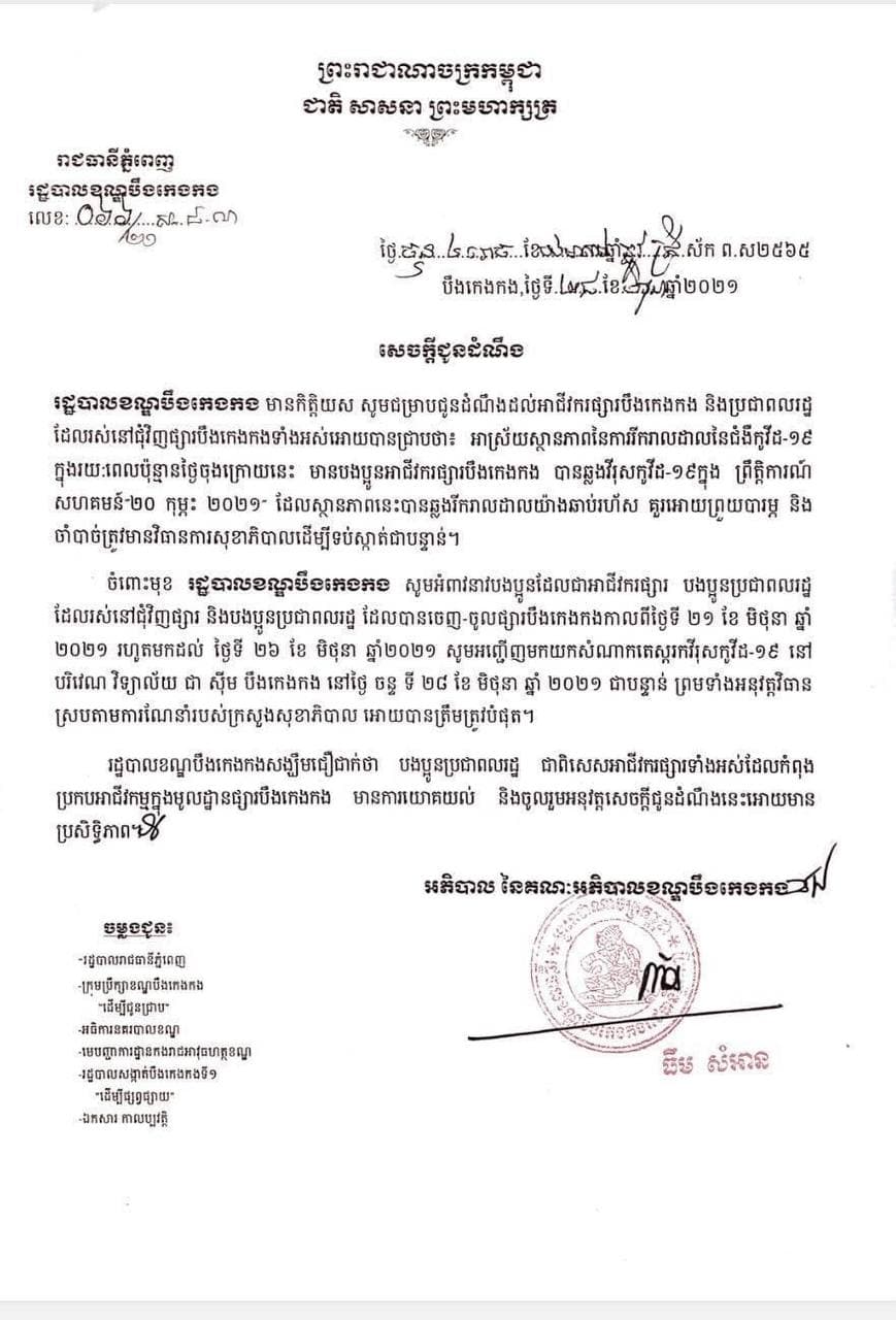 រដ្ឋបាលខណ្ឌបឹងកេងកង សូមអំពាវនាវបងប្អូនដែលជាអាជីវករផ្សារ បងប្អូនប្រជាពលរដ្ឋដែលរស់នៅជុំវិញផ្សារ និងបងប្អូនប្រជាពលរដ្ឋ ដែលបានចេញ-ចូលផ្សារបឹងកេងកង កាលពីថ្ងៃទី២១ ខែមិថុនា ឆ្នាំ២០២១ រហូតដល់ថ្ងៃទី២៦ ខែមិថុនា ឆ្នាំ២០២១ សូមអញ្ជើញមកយកសំណាកតេស្តរកវីរុសកូវីដ-១៩ នៅបរិវេណវិទ្យាល័យ ជាស៊ីម បឹងកេងកង នៅថ្ងៃចន្ទ ទី២៨ ខែមិថុនា ឆ្នាំ២០២១ ជាបន្ទាន់ ព្រមទាំងអនុវត្តវិធានការរបស់ក្រសួងសុខាភិបាល ឲ្យបានត្រឹមត្រូវ ៕