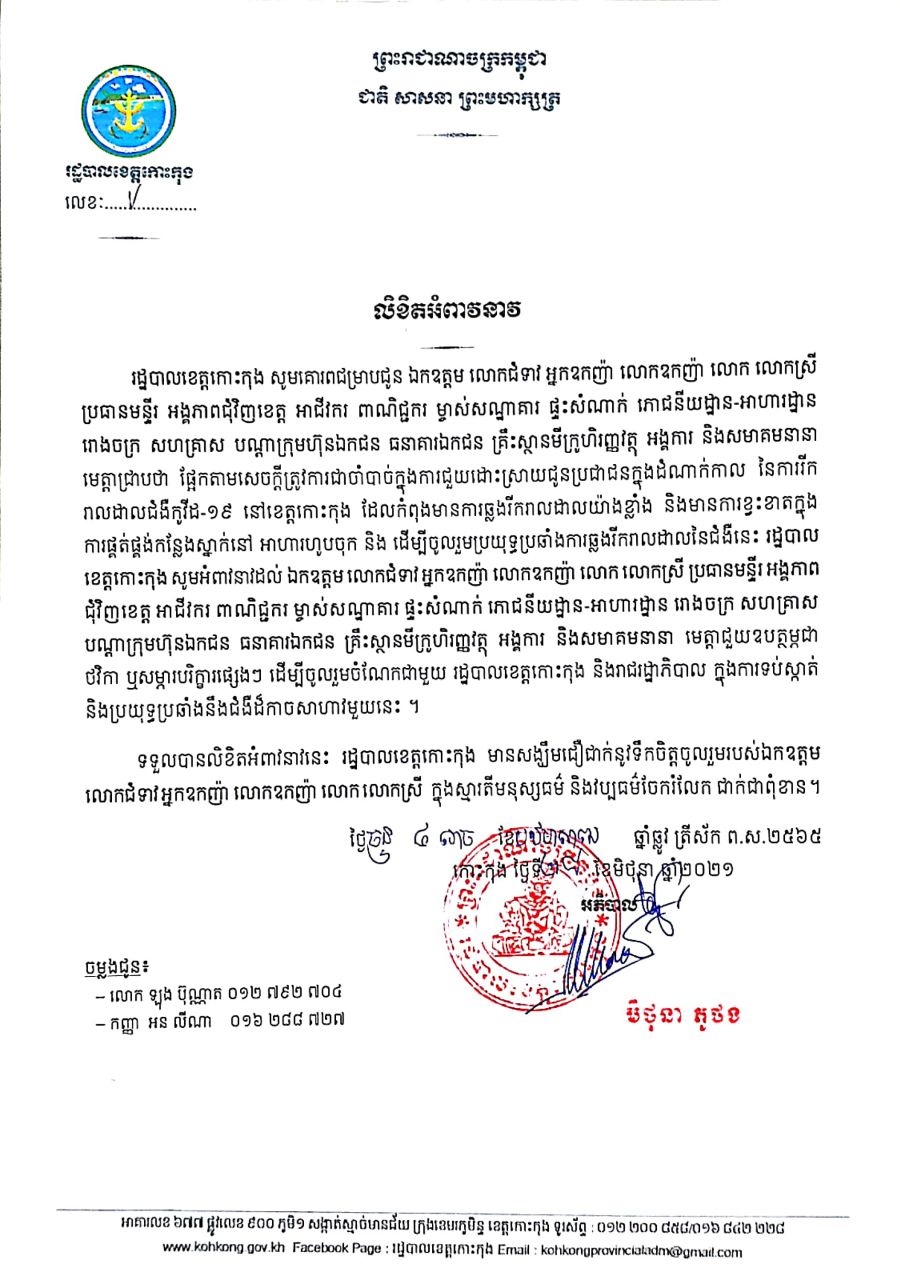រដ្ឋបាលខេត្តកោះកុង ដែលមានលោកជំទាវ មិថុនា ភូថង ជាអភិបាលនៃគណៈអភិបាលខេត្ត បានចេញសេចក្តីអំពាវនាវមួយដើម្បីស្វែងរកការឧបត្ថម្ភពីសំណាក់សប្បុរសជន ជុំវិញខេត្ត រួមមានអាជីវករ ពាណិជ្ជករ ម្ចាស់ផ្ទះសំណាក់ សណ្ឋាគារ ភោជនីយដ្ឋាន អាហារដ្ឋាន រោងចក្រ សហគ្រាស ធនាគារ ក្រុមហ៊ុនឯកជនផ្សេងៗ ដើម្បីធ្វើការឧបត្ថម្ភជាថវិកា ឬសម្ភារបរិក្ខាផ្សេងៗទៀត ដើម្បីចូលរួមចំណែក ក្នុងការទប់ស្កាត់និងប្រយុទ្ធប្រឆាំងនឹងជំងឺកូវីដ-១៩។
