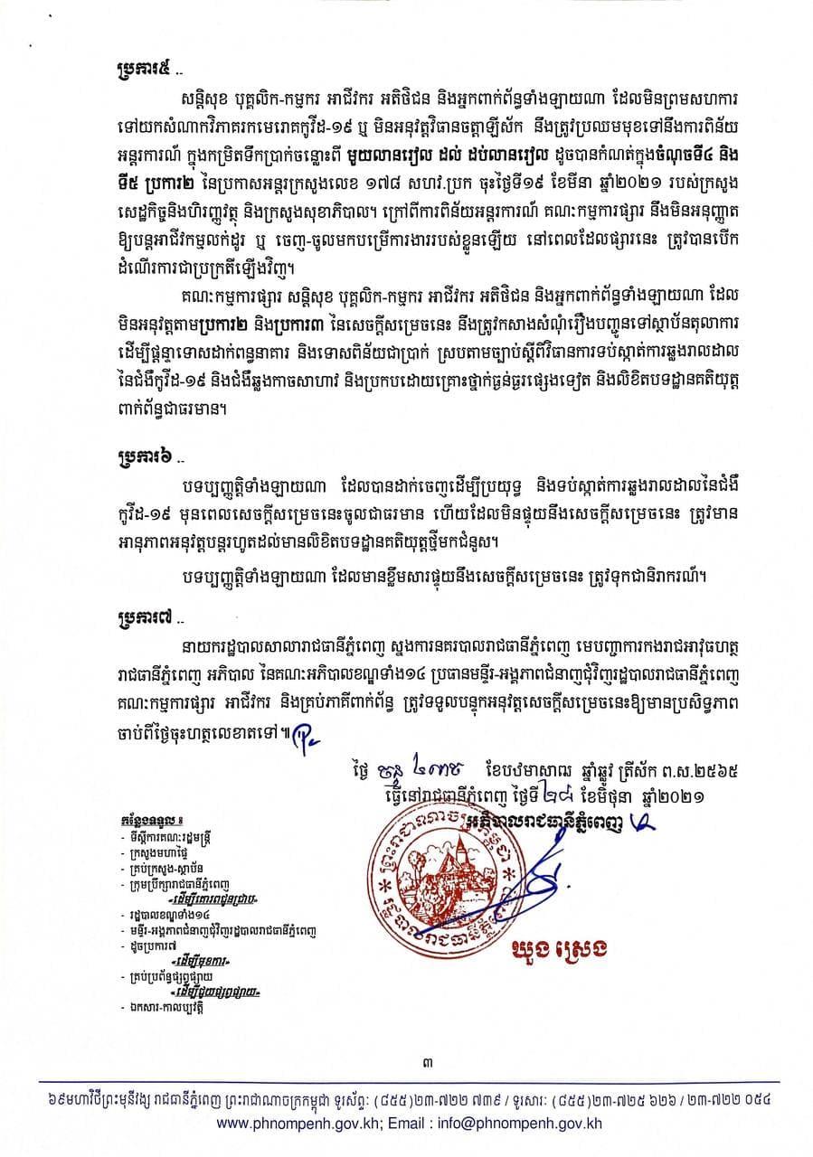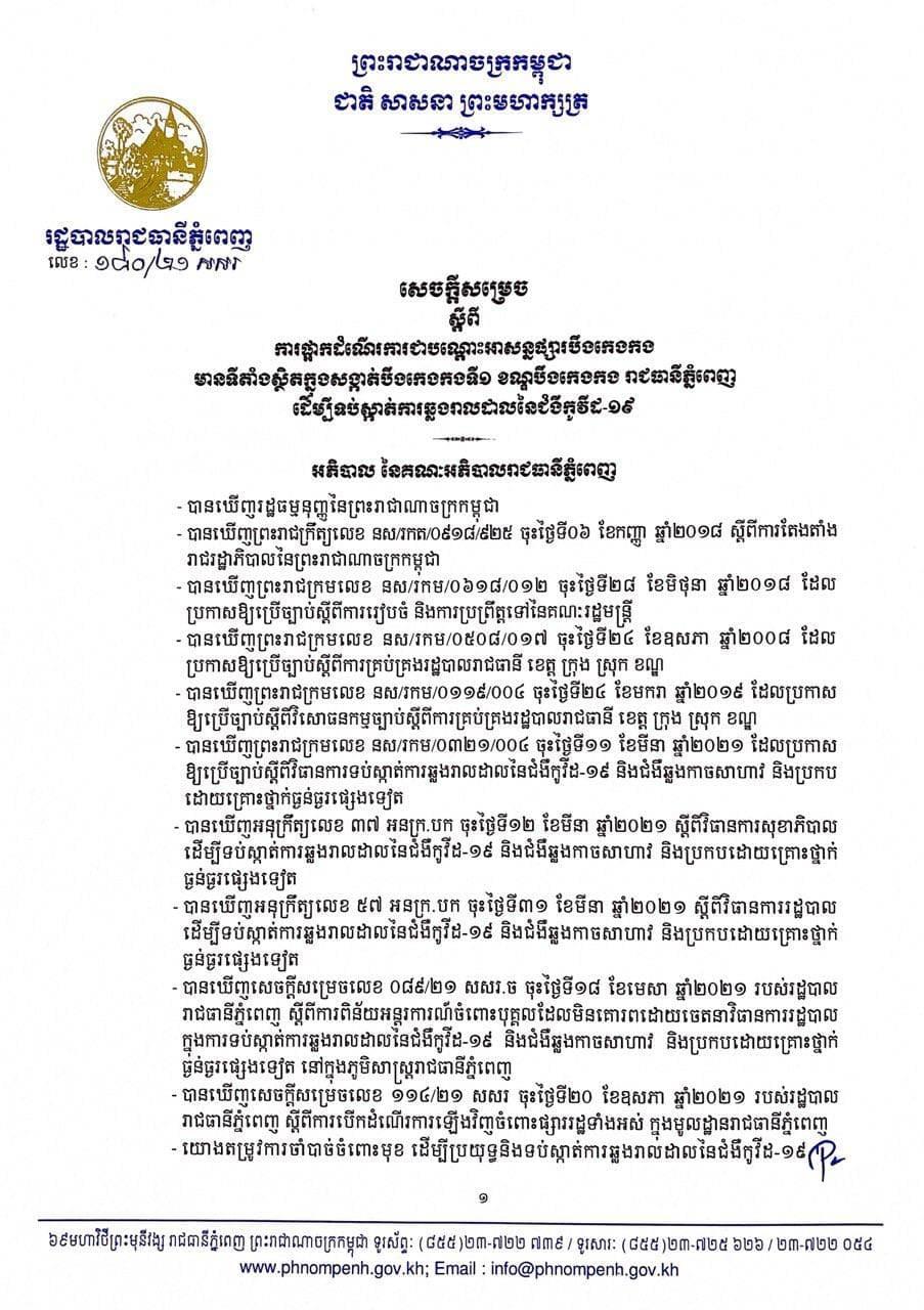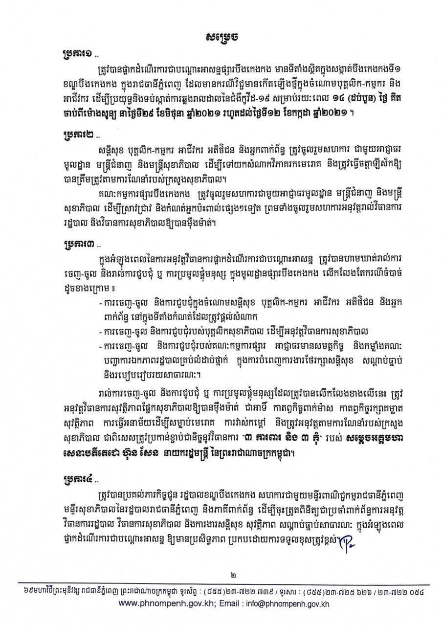ប្រការ១ នៃសេចក្ដីសម្រេចនេះ បានបញ្ជាក់យ៉ាងដូច្នេះថា «ត្រូវបានផ្អាកដំណើរការជាបណ្ដោះអាសន្នផ្សារបឹងកេងកង មានទីតាំងស្ថិតក្នុងសង្កាត់បឹងកេងកងទី១ ខណ្ឌបឹងកេងកង ក្នុងរាជធានីភ្នំពេញ ដែលមានករណីវិជ្ជមានកើតឡើងថ្មី ក្នុងចំណោមបុគ្គលិក កម្មករ និងអាជីវករ ដើម្បីប្រយុទ្ធ និងទប់ស្កាត់ការឆ្លងរាលដាលនៃជំងឺកូវីដ១៩ សម្រាប់រយៈពេល១៤ថ្ងៃ គិតចាប់ពីម៉ោងសូន្យនាថ្ងៃទី២៩ ខែមិថុនា ឆ្នាំ២០២១ រហូតដល់ថ្ងៃទី១២ ខែកក្កដា ឆ្នាំ២០២១»។