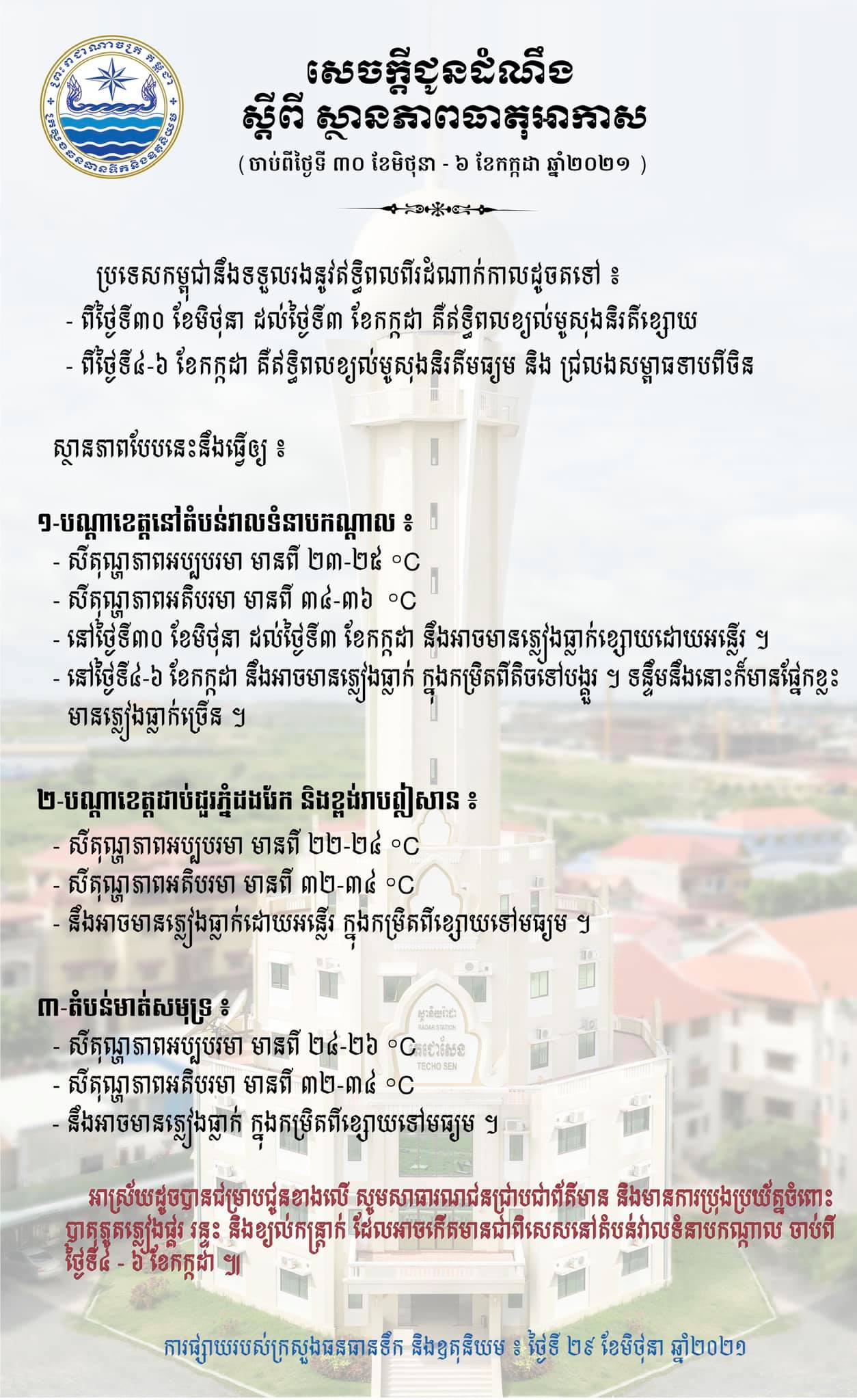 – នៅថ្ងៃទី៣០ ខែមិថុនា ដល់ថ្ងៃទី៣ ខែកក្កដា នឹងអាចមានភ្លៀងធ្លាក់ខ្សោយដោយអន្លើរ