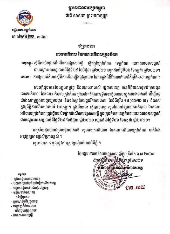 ខេត្តកំពត៖ យោងតាមការចុះផ្សាយរបស់ រដ្ឋបាលខេត្តកំពត នៅថ្ងៃទី២៩ ខែមិថុនា ឆ្នាំ២០២១ បានចេញសេចក្តីជូនដំណឹងស្តីពីការបិទផ្អាកដំណើរការផ្សារសាមគ្គី រយៈពេលមួយសប្តាហ៍ជាបណ្ដោះអាសន្ន ចាប់ពីថ្ងៃទី២៩ ខែមិថុនា ឆ្នាំ២០២១ រហូតដល់ថ្ងៃទី០៦ ខែកក្កដា ឆ្នាំ២០២១។