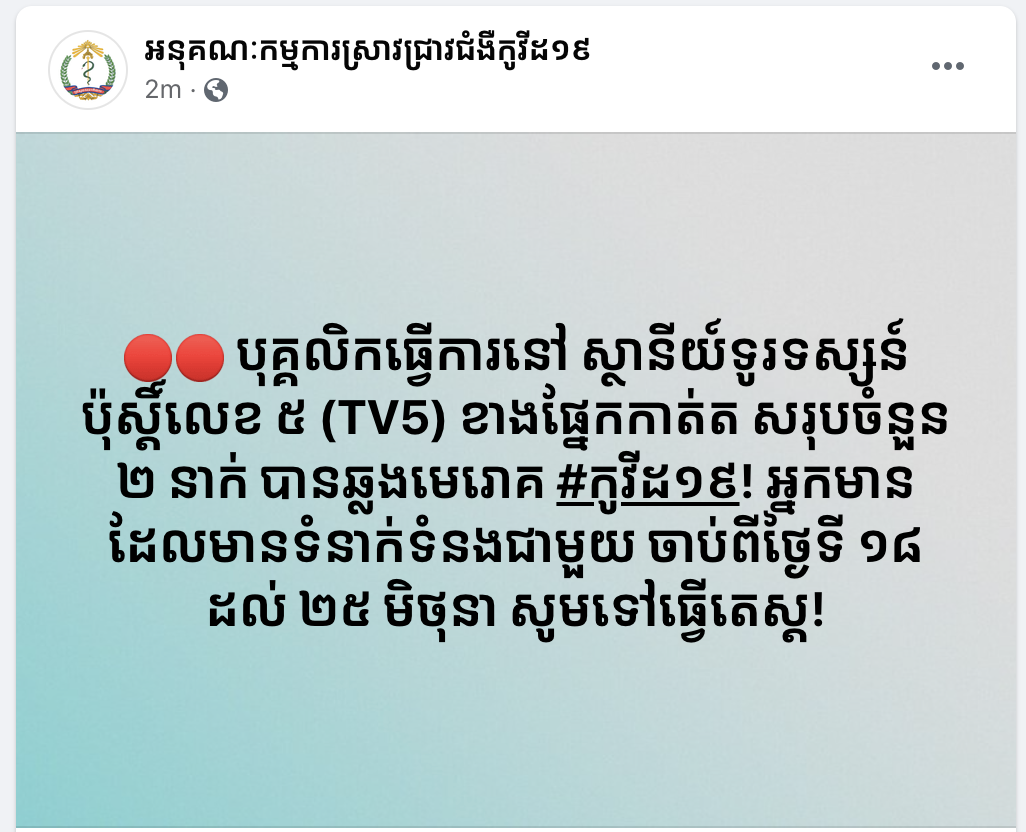 យោងតាមការបញ្ជាក់ពី អនុគណៈកម្មការស្រាវជ្រាវជំងឺកូវីដ១៩ បានឲ្យដឹងថា បុគ្គលិកធ្វើការនៅ ស្ថានីយ៍ទូរទស្សន៍ ប៉ុស្តិ៍លេខ ៥ (TV5) ខាងផ្នែកកាត់ត សរុបចំនួន ២ នាក់ បានឆ្លងមេរោគកូវីដ១៩! អ្នកមានដែលមានទំនាក់ទំនងជាមួយ ចាប់ពីថ្ងៃទី ១៨ ដល់ថ្ងៃទី ២៥ ខែមិថុនា សូមទៅធ្វើតេស្ត!