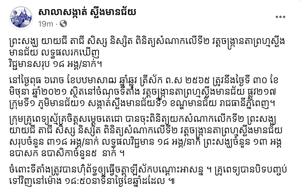 ពិនិត្យសំណាកលើទី២ លើព្រះសង្ឃ យាយជី តាជី និងអ្នកនៅវត្តចង្ក្រានតាព្រហ្មស្ទឹងមានជ័យ ជាង៣០០អង្គ/នាក់ រកឃើញលទ្ធផលវិជ្ជមានសរុប ១៨ អង្គ/នាក់