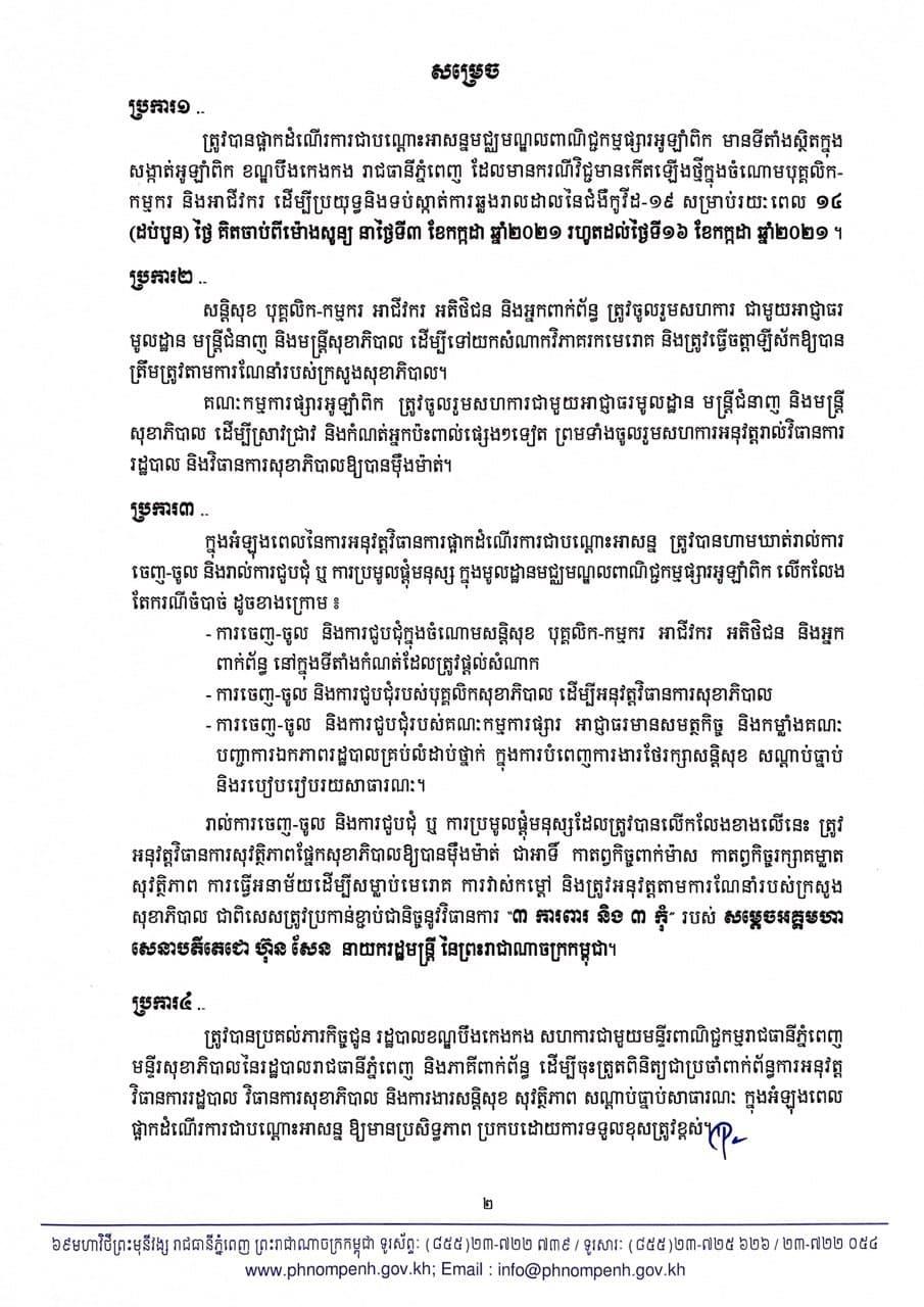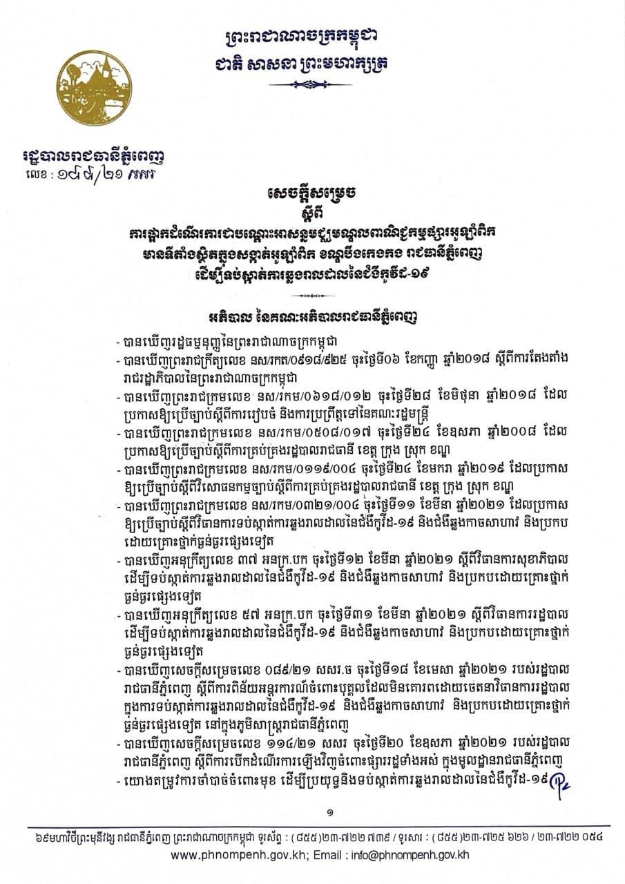 យោងតាមលិខិតរបស់ រដ្ឋបាលរាជធានីភ្នំពេញ បានធ្វើការសម្រេចផ្អាកដំណើរការជាបណ្តោះអាសន្នមជ្ឈមណ្ឌលពាណិជ្ជកម្មផ្សារអូឡាំពិក មានទីតាំងស្ថិតក្នុងសង្កាត់អូឡាំពិក ខណ្ឌបឹងកេងកង រាជធានីភ្នំពេញ ដែលមានករណីវិជ្ជជំងឺកូវីដ១៩មានកើតឡើងថ្មីក្នុងចំណោមបុគ្គលិក កម្មករ និងអាជីវករ ដើម្បីប្រយុទ្ធនិងទប់ស្កាត់ការឆ្លងរាលដាលនៃជំងឺកូវីដ១៩ សម្រាប់រយៈពេល១៤ថ្ងៃ គិតចាប់ពីម៉ោងសូន្យ នាថ្ងៃទី៣ ខែកក្កដា ឆ្នាំ២០២១ រហូតដល់ថ្ងៃទី១៦ ខែកក្កដា ឆ្នាំ២០២១។