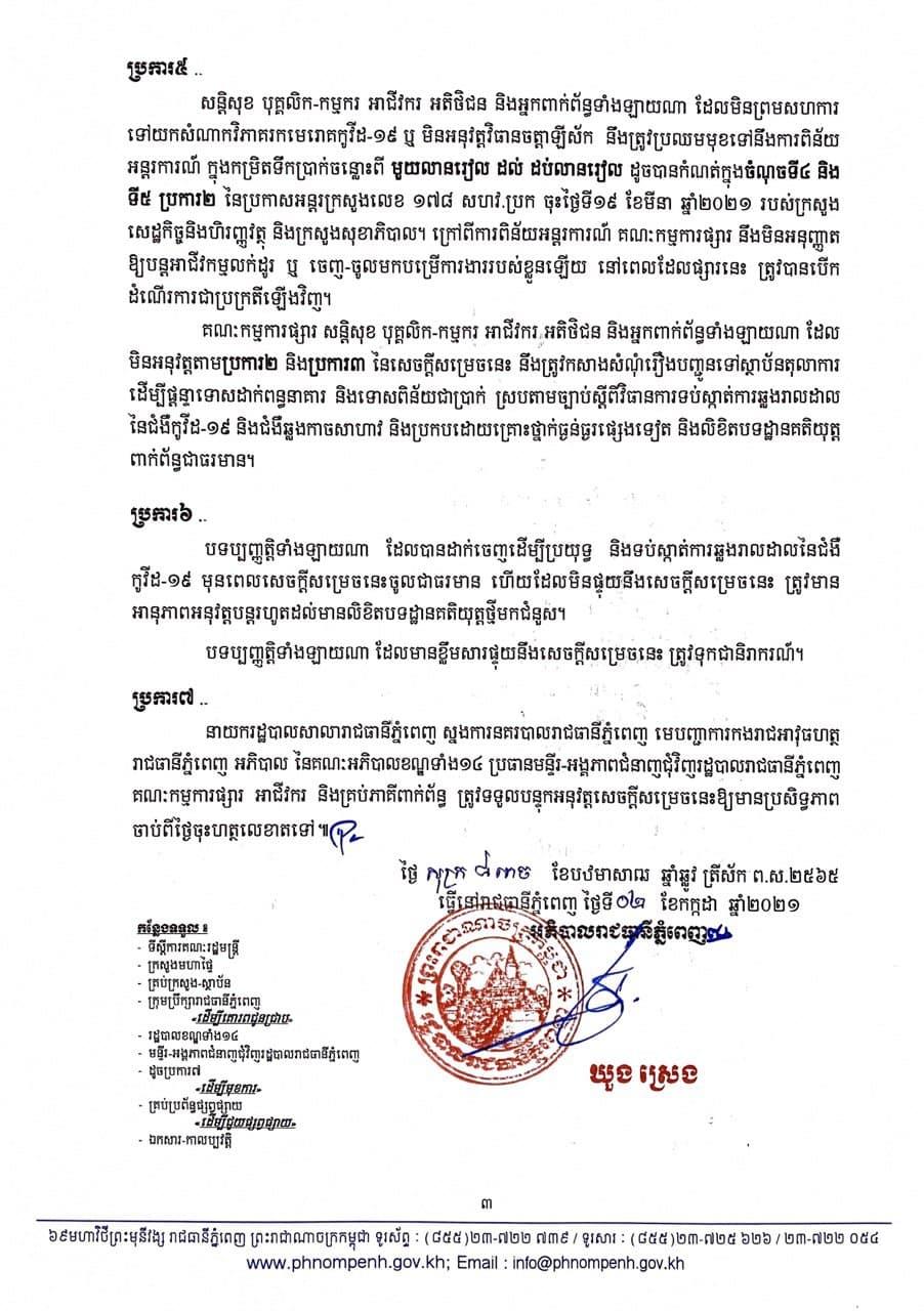 សន្តិសុខ បុគ្គលិក កម្មករ អាជីវករ  អតិថិជន និងអ្នកពាក់ព័ន្ធ ទាំងអស់ត្រូវចូលរួមសហការ ជាមួយអាជ្ញាធរមូលដ្ឋាន មន្ត្រីជំនាញ និងមន្ត្រីសុខាភិបាល ដើម្បីទៅយកសំណាកវិភាគរកមេរោគ និងត្រូវធ្វើចត្តាឡីស័កឲ្យបានត្រឹមត្រូវតាមការណែនាំរបស់ក្រសួងសុខាភិបាល៕