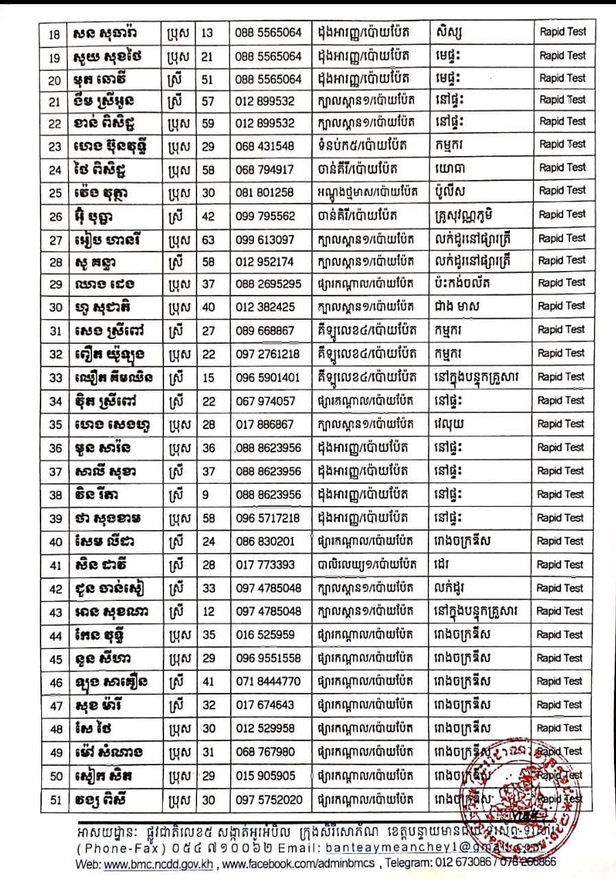 រដ្ឋបាលខេត្តបន្ទាយជ័យ រកឃើញអ្នកជំងឺកូវីដ-១៩ថ្មី ចំនួន៨៨នាក់ និងជាសះស្បើយ ១៦នាក់បន្ថែម