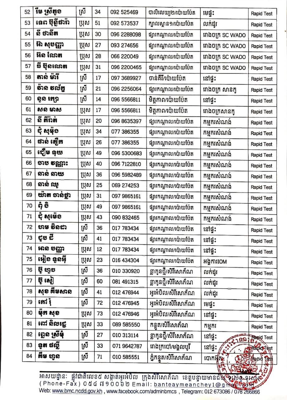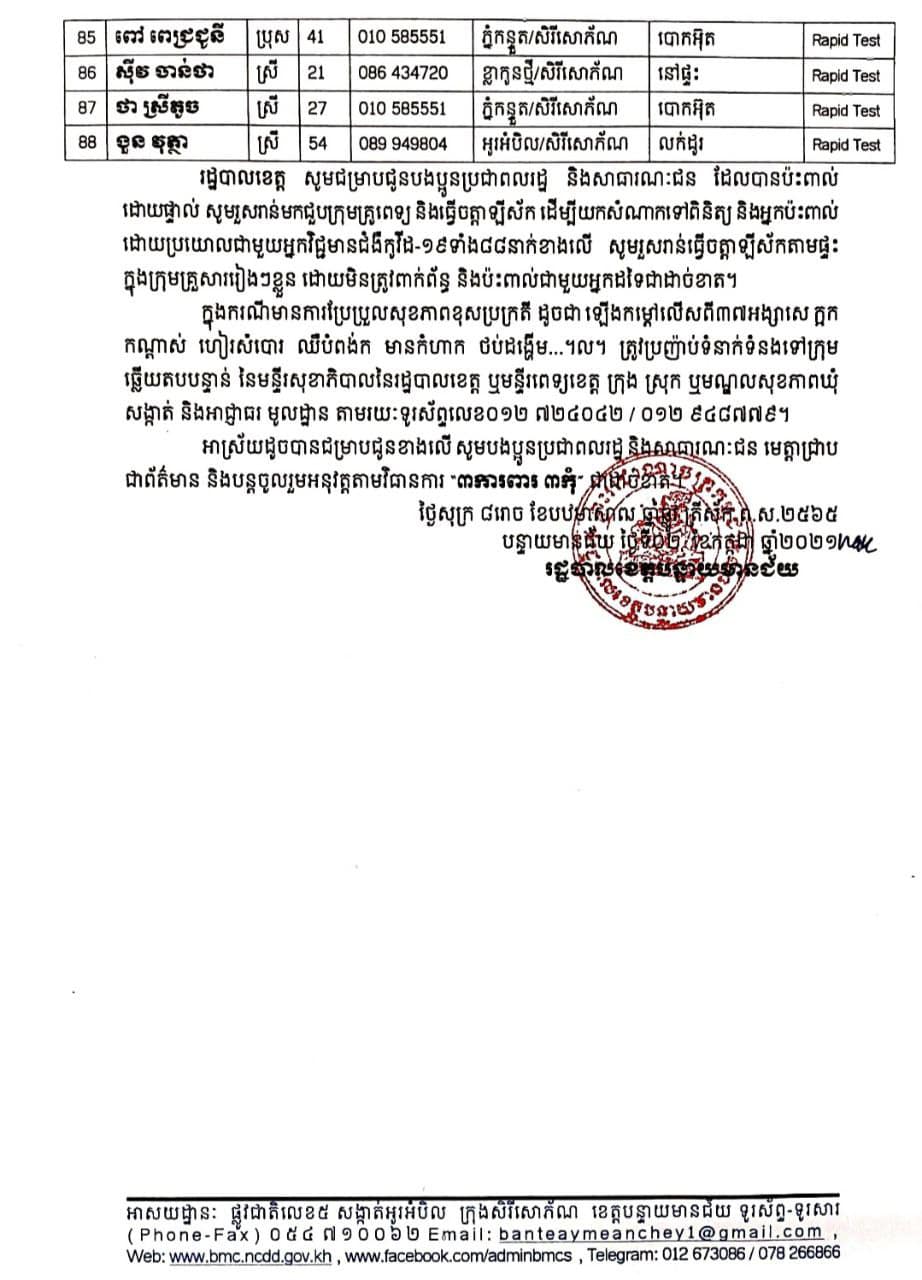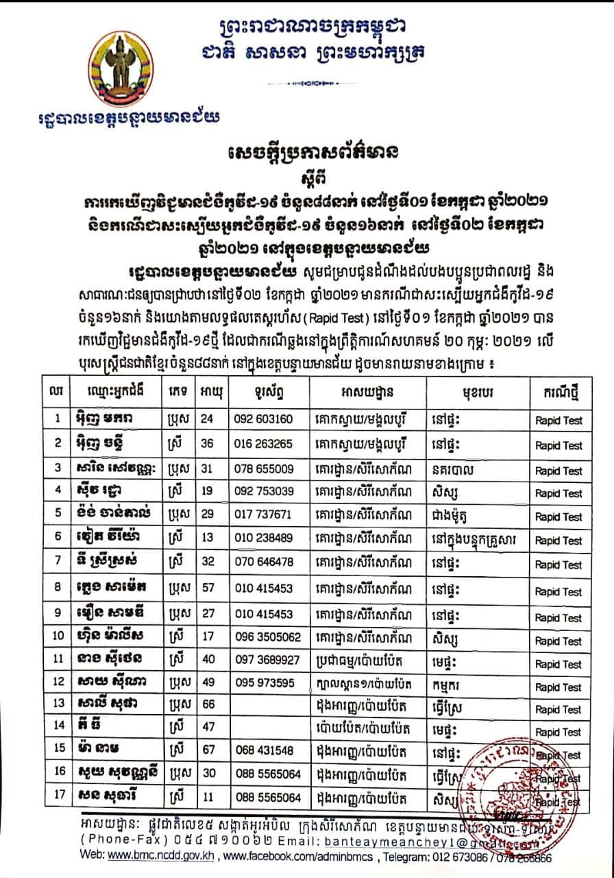 ខេត្តបន្ទាយមានជ័យ៖ យោងតាមការចុះផ្សាយរបស់ រដ្ឋបាលខេត្តបន្ទាយជ័យ បានចេញសេចក្ដីប្រកាសព័ត៌មាន ស្ដីពីការរកឃើញវិជ្ជមានកូវីដ-១៩ ចំនួន៨៨នាក់ និងជាសះស្បើយ ១៦នាក់ ក្នុងខេត្តបន្ទាយមានជ័យ។ ដោយរដ្ឋបាលខេត្ត សូមជម្រាបជូនដំណឹងដល់បងប្អូនប្រជាពលរដ្ឋ និងសាធារណជនឲ្យបានជ្រាបថា នៅថ្ងៃទី០២ ខែកក្កដា ឆ្នាំ២០២១ មានករណីជាសះស្បើយអ្នកជំងឺកូវីដ-១៩ ចំនួន១៦នាក់ និងយោងតាមលទ្ធផលតេស្តរហ័ស នៅថ្ងៃទី០១ ខែកក្កដា ឆ្នាំ២០២១ បានរកឃើញវិជ្ជមានកូវីដ-១៩ ដែលជាករណីឆ្លងក្នុងព្រឹត្តិការណ៍សហគមន៍២០ កុម្ភៈ ២០២១ លើបុរស ស្ត្រីជនជាតិខ្មែរ នៅក្នុងខេត្តបន្ទាយមានជ័យ ដូចមានរាយនាមខាងក្រោម៖