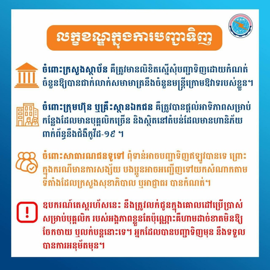 ក្រសួងប្រៃសណីយ៍និងទូរគមនាគមន៍នឹងនាំចូលឧបករណ៍តេស្តរហ័សអង់ទីហ្សែនកូវីដ-១៩ (Covid-19 Rapid Antigen Test) ពីប្រទេសកូរ៉េ ដើម្បីចែកចាយបន្តក្នុងតម្លៃដើម ៣,៧ ដុល្លារអាម៉េរិក ក្នុងមួយឧបករណ៍។ ឧបករណ៍តេស្តរហ័សនេះ នឹងត្រូវលក់ជូនក្នុងគោលដៅយកទៅប្រើប្រាស់តែប៉ុណ្ណោះ ដោយមិនត្រូវយកទៅលក់បន្តឡើយ។ ខាងក្រោមនេះគឺជាលក្ខខណ្ឌ និងរបៀបបញ្ជាទិញឧបករណ៍តេស្តរហ័សអង់ទីហ្សែនកូវីដ-១៩ (Covid-19 Rapid Antigen Test)៕