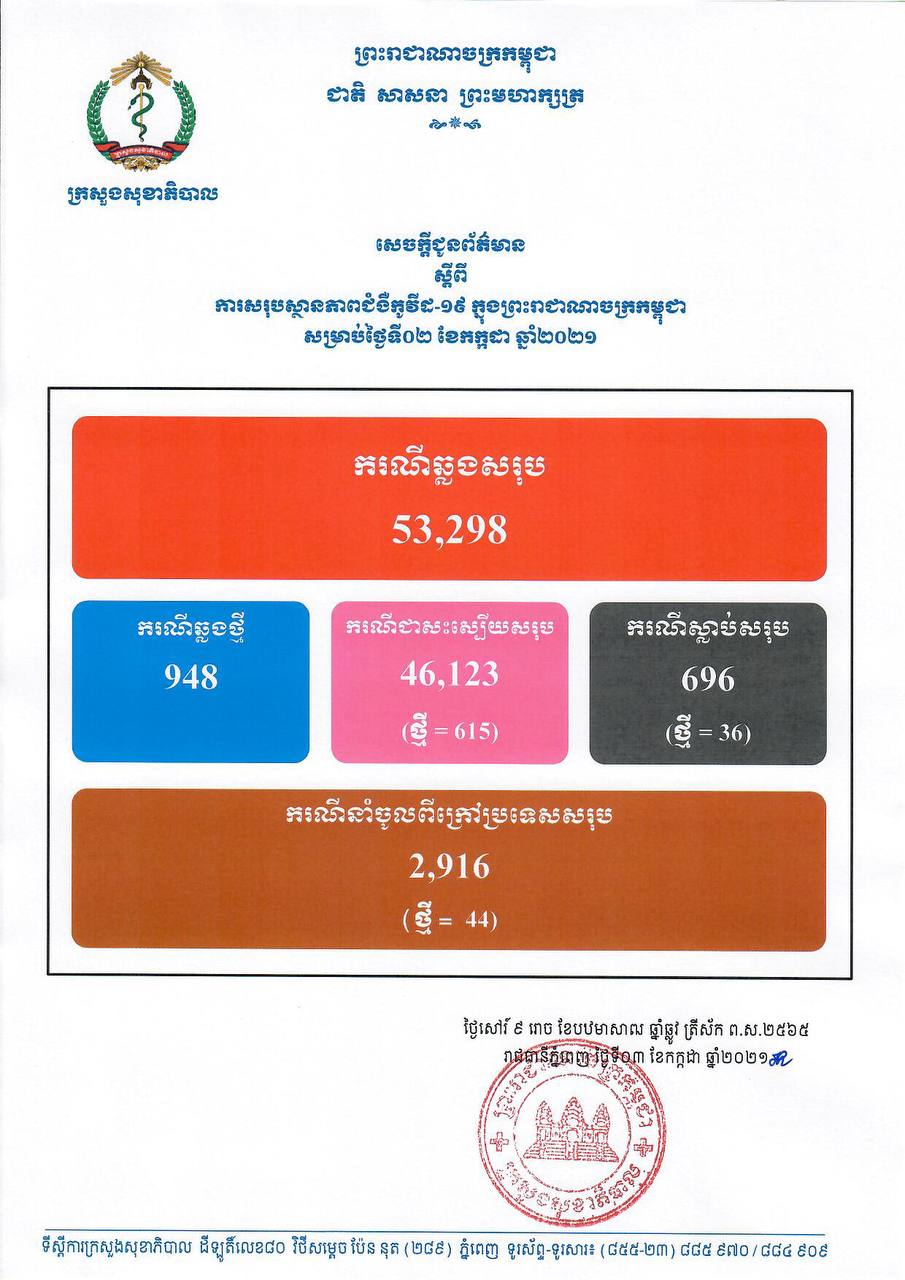នៅថ្ងៃទី០៣ ខែកក្កដា ឆ្នាំ២០២១នេះ ក្រសួងសុខាភិបាលកម្ពុជា បានចេញសេចក្តីជូនដំណឹងពី ការរកឃើញករណីវិជ្ជមានវីរុសកូវីដ១៩ថ្មី ចំនួន ៩៤៨នាក់ ខណៈអ្នកបានជាសះស្បើយថ្មីមានចំនួន ៦១៥នាក់ និងមានអ្នកបាត់បង់ជីវិត៣៦នាក់។ គិតមកទល់ពេលនេះ ករណីឆ្លងកូវីដ១៩ សរុបនៅក្នុងប្រទេសកម្ពុជា មានចំនួន ៥៣,២៩៨នាក់, ករណីជាសះស្បើយសរុប ៤៦,១២៣នាក់ និងស្លាប់សរុប ៦៩៦នាក់៕