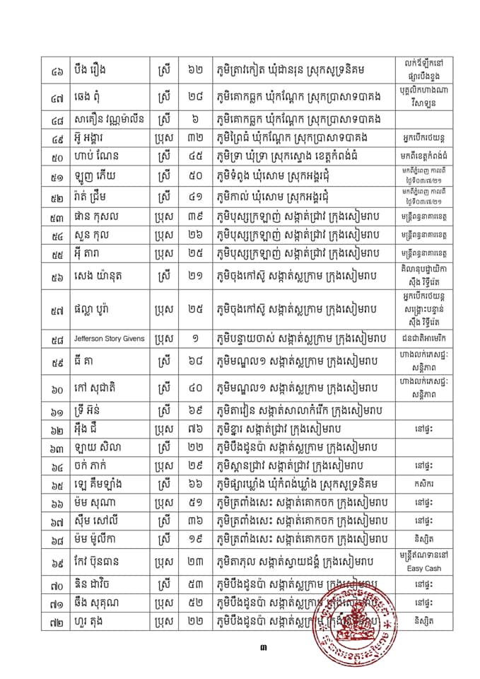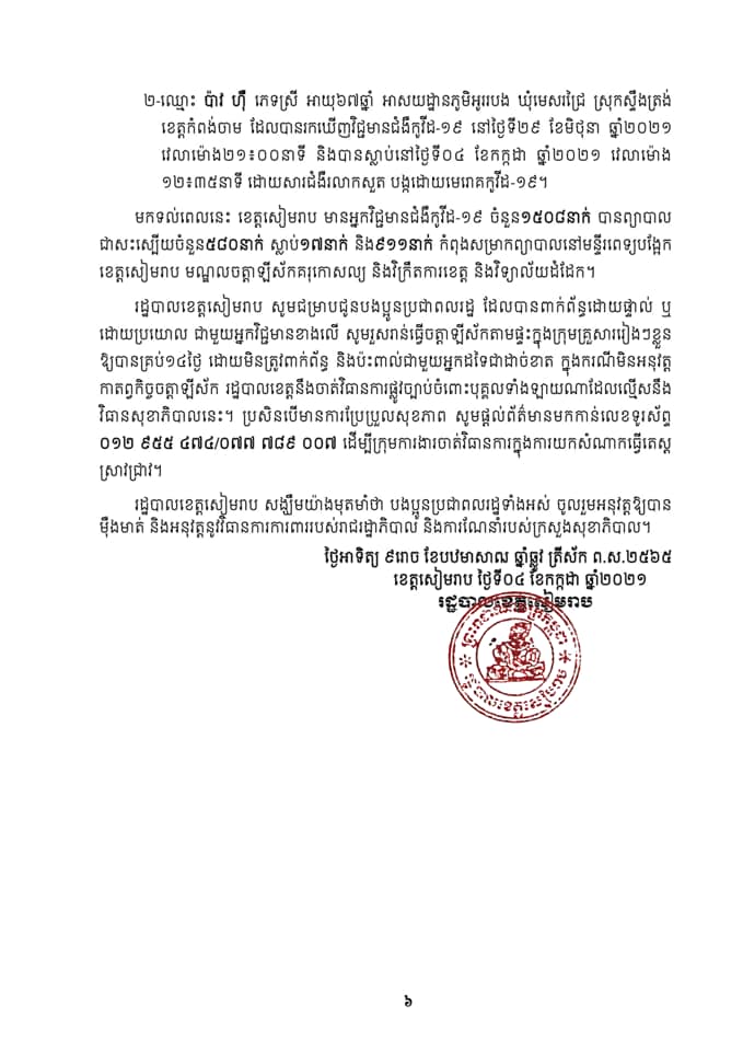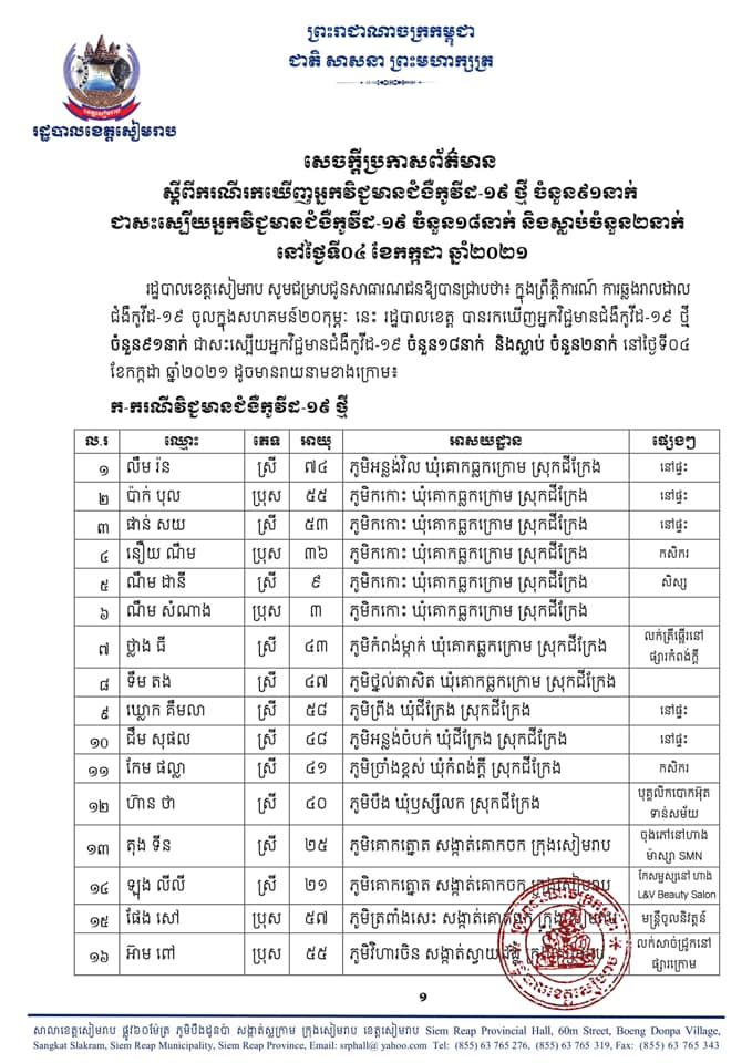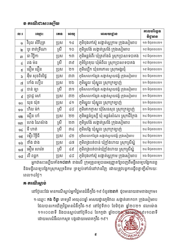 ១-ឈ្មោះ កង ចិន្ដា ភេទស្រី អាយុ៤០ឆ្នាំ អាសយដ្ឋានភូមិវាល សង្កាត់គោកចក ក្រុងសៀមរាប ដែលបានរកឃើញវិជ្ជមានជំងឺកូវីដ-១៩ នៅថ្ងៃទី៣០ ខែមិថុនា ឆ្នាំ២០២១ វេលាម៉ោង១១៖០០នាទី និងបានស្លាប់នៅថ្ងៃទី០៤ ខែកក្កដា ឆ្នាំ២០២១ វេលាម៉ោង០៩៖១០នាទី ដោយសារជំងឺរលាកសួត បង្កដោយមេរោគកូវីដ-១៩។
