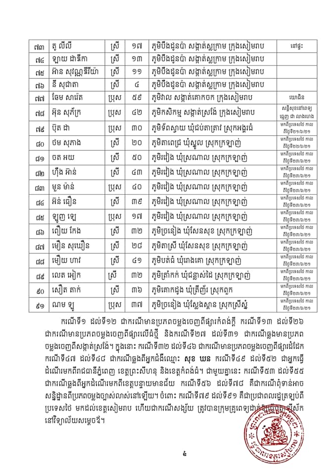 + ករណីទី៧៩ ដល់ទី៩១ គឺជាប្រជាពលរដ្ឋត្រឡប់ពីប្រទេសថៃ មកដល់ខេត្តសៀមរាប ហើយជាករណីសង្ស័យ ត្រូវបានក្រុមគ្រូពេទ្យដាក់ឱ្យធ្វើចត្តាឡីស័ក នៅវិទ្យាល័យសម្តេចឪ។