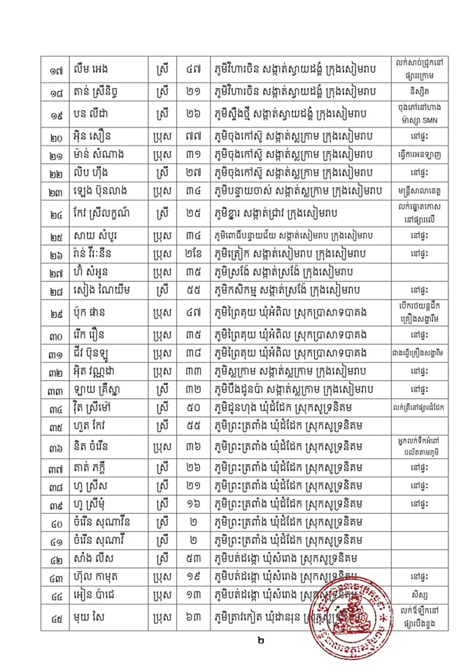 រដ្ឋបាលខេត្តសៀមរាប សូមជម្រាបជូនបងប្អូនប្រជាពលរដ្ឋ ដែលបានពាក់ព័ន្ធដោយផ្ទាល់ ឬដោយប្រយោល ជាមួយអ្នកវិជ្ជមានខាងលើ សូមរួសរាន់ធ្វើចត្តាឡីស័កតាមផ្ទះក្នុងក្រុមគ្រួសាររៀងៗខ្លួនឱ្យបានគ្រប់១៤ថ្ងៃ ដោយមិនត្រូវពាក់ព័ន្ធ និងប៉ះពាល់ជាមួយអ្នកដទៃជាដាច់ខាត ក្នុងករណីមិនអនុវត្តកាតព្វកិច្ចចត្តាឡីស័ក រដ្ឋបាលខេត្តនឹងចាត់វិធានការផ្លូវច្បាប់ចំពោះបុគ្គលទាំងឡាយណាដែលលើ្មសនឹងវិធានសុខាភិបាលនេះ។ ប្រសិនបើមានការប្រែប្រួលសុខភាព សូមផ្តល់ព័ត៌មានមកកាន់លេខទូរស័ព្ទ០១២ ៩៥៥ ៤៧៤/០៧៧ ៧៨៩ ០០៧ ដើម្បីក្រុមការងារចាត់វិធានការក្នុងការយកសំណាកធ្វើតេស្តស្រាវជ្រាវ។