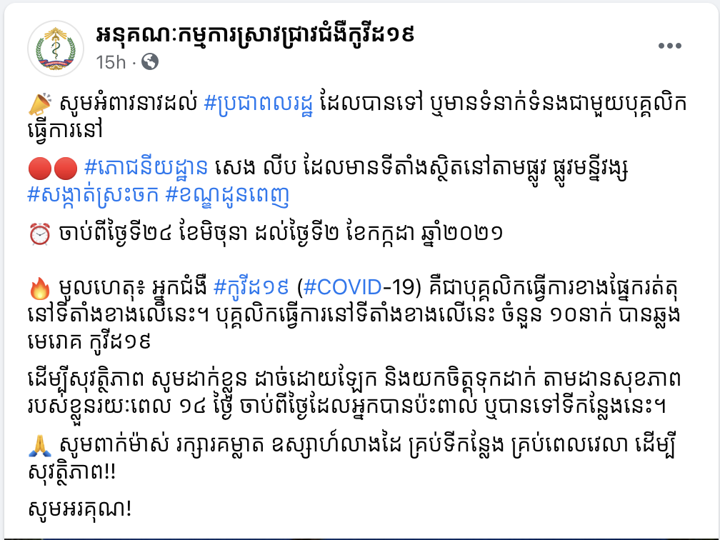 យោងតាមការបញ្ជាក់ពី អនុគណៈកម្មការស្រាវជ្រាវជំងឺកូវីដ១៩ បានឲ្យដឹងថា សូមអំពាវនាវដល់ប្រជាពលរដ្ឋ ដែលបានទៅ ឬមានទំនាក់ទំនងជាមួយបុគ្គលិកធ្វើការនៅភោជនីយដ្ឋាន សេង លីប ដែលមានទីតាំងស្ថិតនៅតាមផ្លូវមុន្នីវង្ស សង្កាត់ស្រះចក ខណ្ឌដូនពេញ ចាប់ពីថ្ងៃទី២៤ ខែមិថុនា ដល់ថ្ងៃទី២ ខែកក្កដា ឆ្នាំ២០២១។