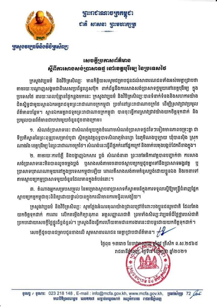 ក្រសួងវប្បធម៌ ចេញសេចក្តីប្រកាសព័ត៌មាន ស្តីពីការសាងសង់ប្រាសាទថ្ម នៅប្រទេសថៃ ដោយភាគីព្រះចៅអធិការវត្ត នៅប្រទេសថៃ បញ្ជាក់ថាមិនបានលួចចម្លងប្លង់ប្រាសាទនៅកម្ពុជាទេ គឺសង់តាមគំនូសប្លង់ដោយខ្លួនឯង