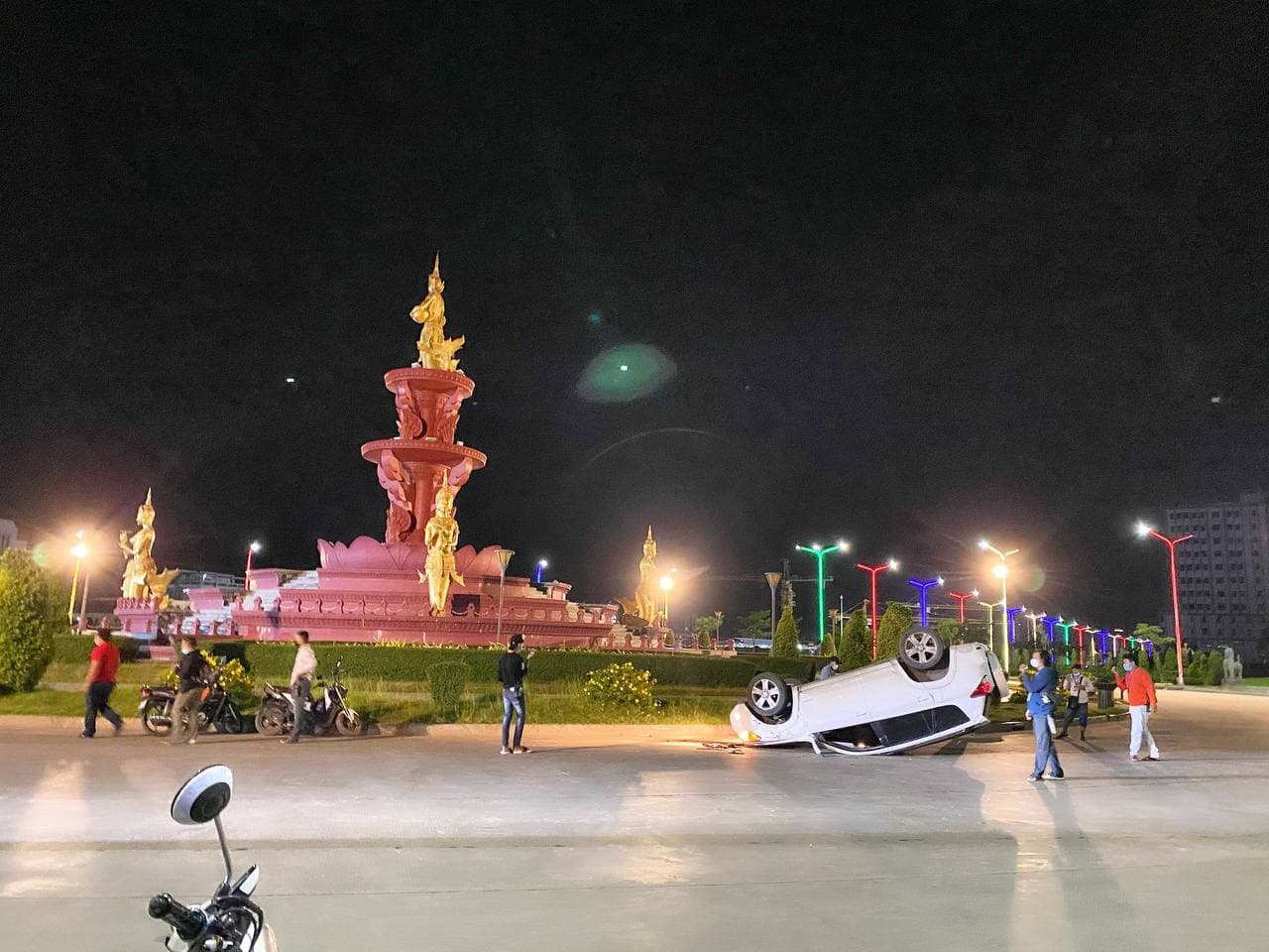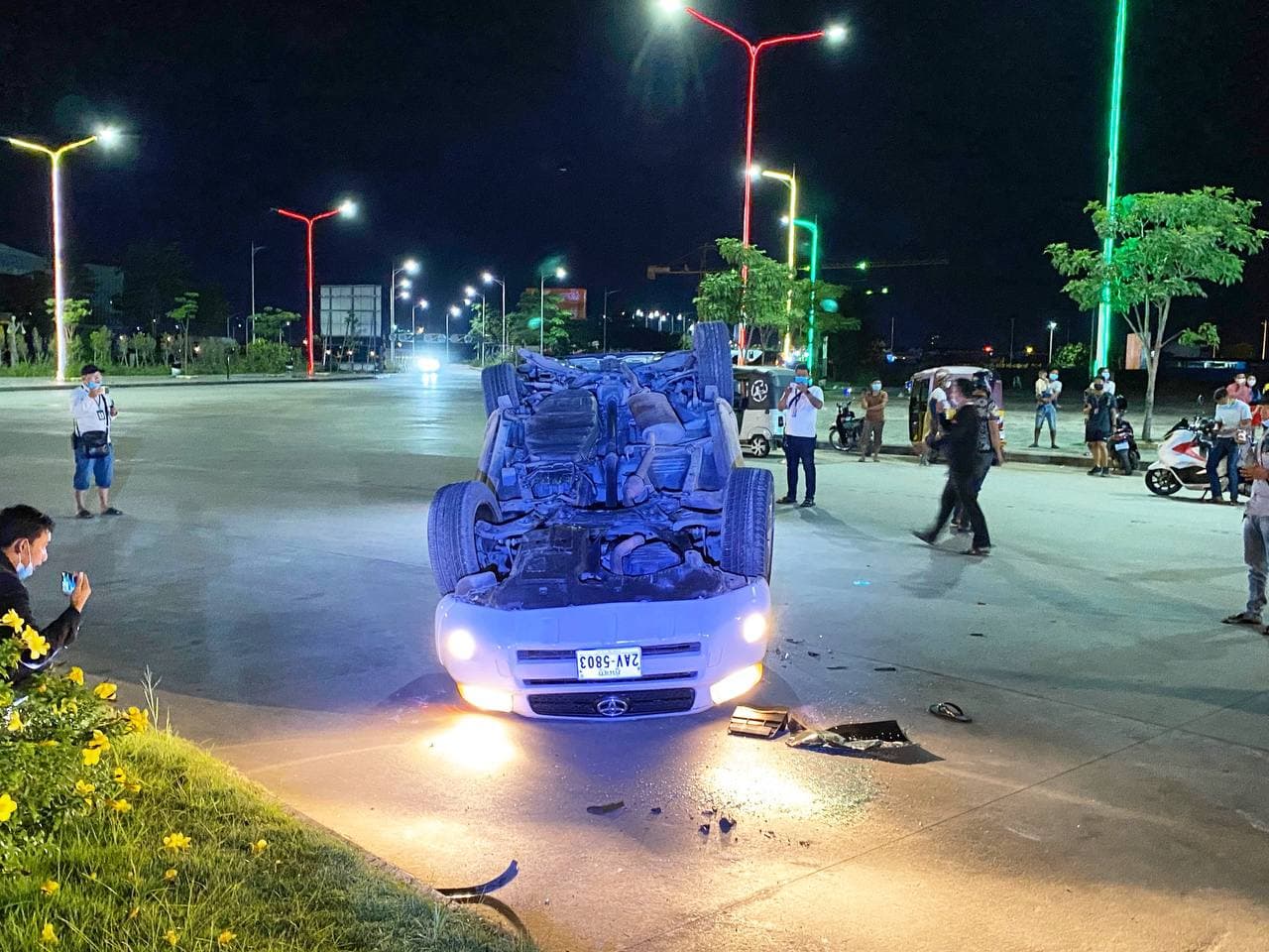 តាមសាក្សីនៅកន្លែងកើតហេតុបានឲ្យអ្នកយកព័ត៌មានខ្មែរណូតយើងថា គេឃើញរថយន្ដបង្កខាងលើ បើកបរទិសដៅពីត្បូងទៅជើង តាមបណ្ដោយផ្លូវ អូស៊ីអាយស៊ី លុះពេលបើកបរមកដល់ត្រង់ចំណុចកើតហេតុ បានជ្រុលល្បឿនទៅបុកគែមរង្វង់មូលសួនច្បារ នាងមច្ឆាយ៉ាងពេញទំហឹង បណ្តាលឲ្យបាក់បែកអស់មួយចំនួន។ ចំណែករថយន្ដបានក្រឡាប់ផ្ងារជើងឡើងលើ ហើយភ្លាមៗនោះ គេឃើញបុរសម្នាក់បានលូនចេញរពីថយន្ដ ទាំងស្ថានភាពស្រវឹងស្រា រីឯរថយន្តរងការខូចខាតយ៉ាងដំណំ តែក្នុងករណីនេះ ក៏មិនបណ្ដាលឱ្យនរណាម្នាក់រងរបួសនោះទេ ។