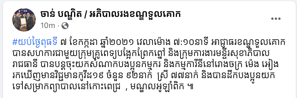 យោងតាមការបញ្ជាក់នៅលើគណនីហ្វេសប៊ុករបស់លោក ចាន់ បណ្ឌិត អភិបាលរងខណ្ឌទួលគោក បានឲ្យដឹងថា យប់ថ្ងៃពុធទី ៧ ខែកក្កដា ឆ្នាំ២០២១ វេលាម៉ោង ៧:១០នាទី អាជ្ញាធរខណ្ឌទួលគោក បានសហការជាមួយក្រុមគ្រូពេទ្យបង្អែកព្រែកព្នៅ និងក្រុមការងារមន្ទីរសុខាភិបាលរាជធានី បានបន្តចុះយកសំណាកបងប្អូនកម្មករ និងកម្មការីនីនៅរោងចក្រ ម៉េង អៀង រកឃើញមានវិជ្ជមានកូវីដ១៩ ចំនួន ៩២នាក់ ស្រី ៧៧នាក់ និងបានដឹកបងប្អូនយកទៅសម្រាកព្យាបាលនៅកោះពេជ្រ , មណ្ឌលអូឡាំពិក៕