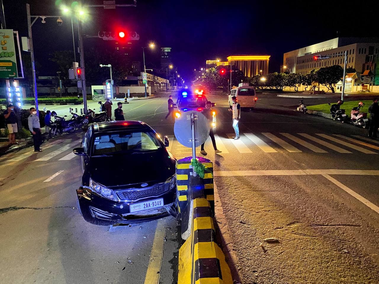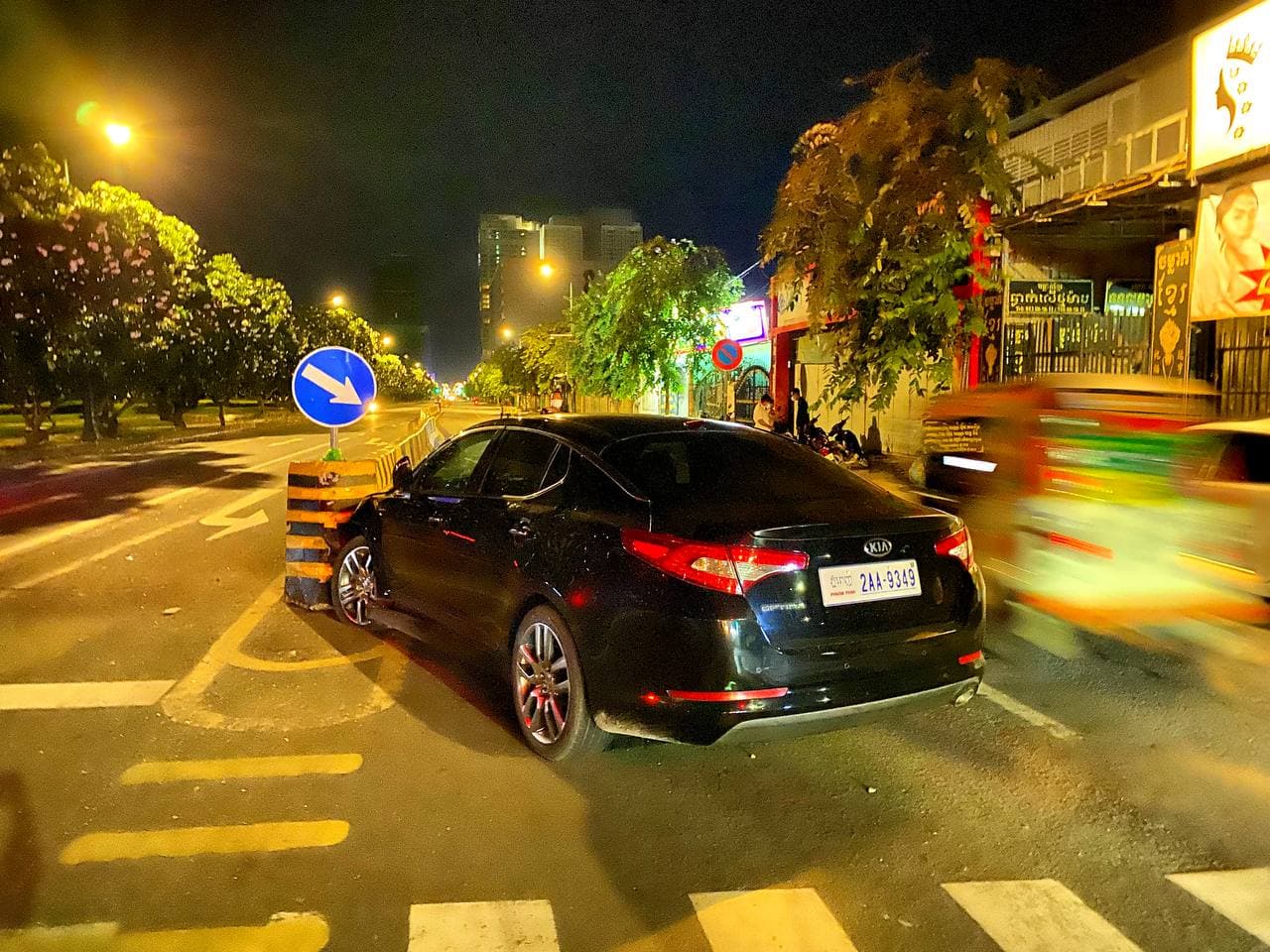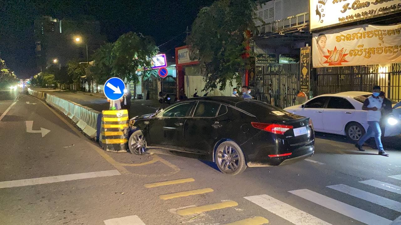 រថយន្ត KIA OPTIMA បើកបុករបាំងថ្មក្បាលព្រួញពុះចែកទ្រូងផ្លូវពេញទំហឹង បណ្ដាលឲ្យរថយន្តជិះទៅមុខលែងរួច បង្កការភ្ញាក់ផ្អើលដល់អ្នកដំណើររាយការណ៍ទៅសមត្ថកិច្ច