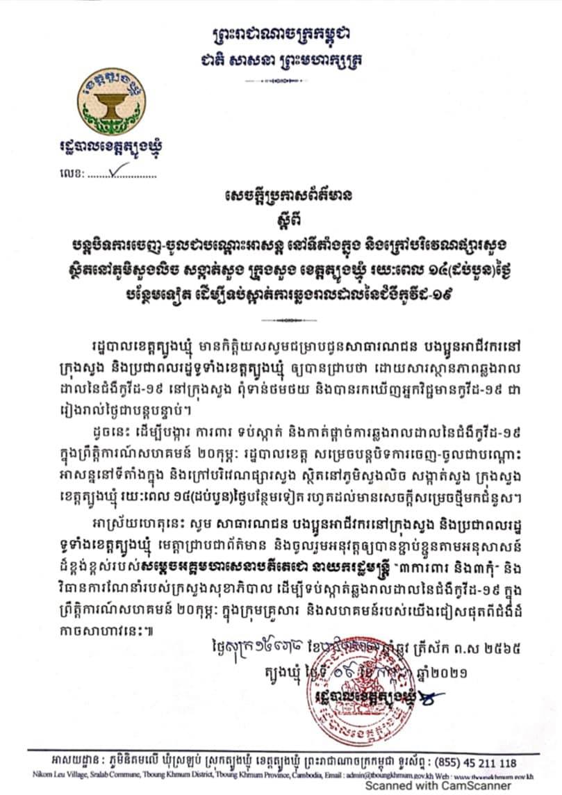 ខេត្តត្បូងឃ្មុំ៖ យោងតាមការចុះផ្សាយរបស់ ការិយាល័យផ្សព្វផ្សាយអប់រំ ខេត្តត្បូងឃ្មុំ បានចេញសេចក្ដីជូនដំណឹង និងសូមអំពាវនាវដោយទទូចដល់បងប្អូនអាជីវករលក់ដូរក្នុង និងក្រៅផ្សារសួងទាំងអស់ ដែលមិនទាន់បានទៅយកសំណាកធ្វើតេស្តរកមេរោគកូវីដ-១៩ នៅវិទ្យាល័យសម្តេចតេជោ ហ៊ុន សែន សួន មេត្តារួសរាន់ទៅយកសំណាកឲ្យបានគ្រប់ៗគ្នា ដើម្បីទទួលបានលិខិតបញ្ជាក់ពីការិយាល័យសុខាភិបាលស្រុកសួង បញ្ជាក់ថាបងប្អូនអាជីវករមិនមានឆ្លងជំងឺកូវីដ-១៩ (លទ្ធផលតេស្តអវិជ្ជមាន) ទុកបង្ហាញក្រុមការងារក្រុងត្រួតពិនិត្យ ទើបបងប្អូនអាចចូលលក់ដូរបាន នៅពេលបើកដំណើរការផ្សារសួងឡើងវិញ។