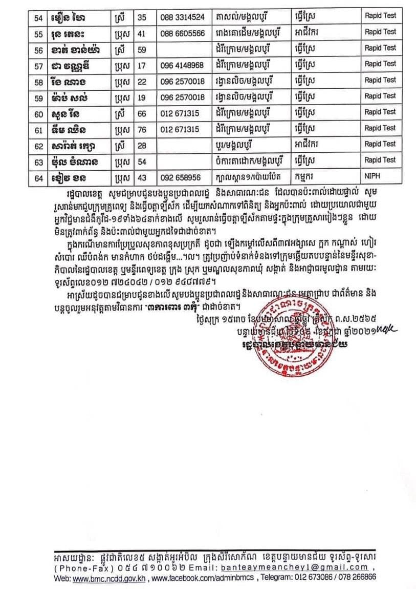 គិតត្រឹមថ្ងៃនេះ ខេត្តចំនួនពីរ បានរកឃើញអ្នកវិជ្ជមានកូវីដ-១៩ ចំនួន ៦៤នាក់បន្ថែមទៀត