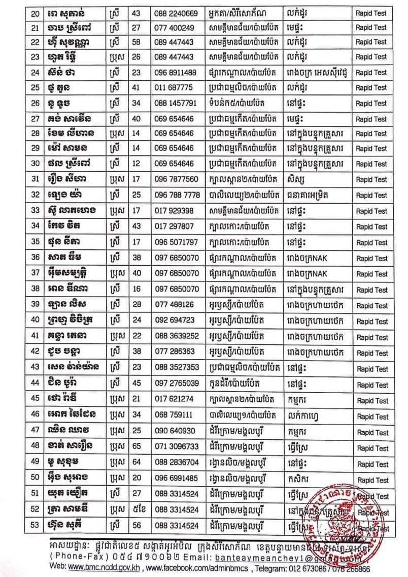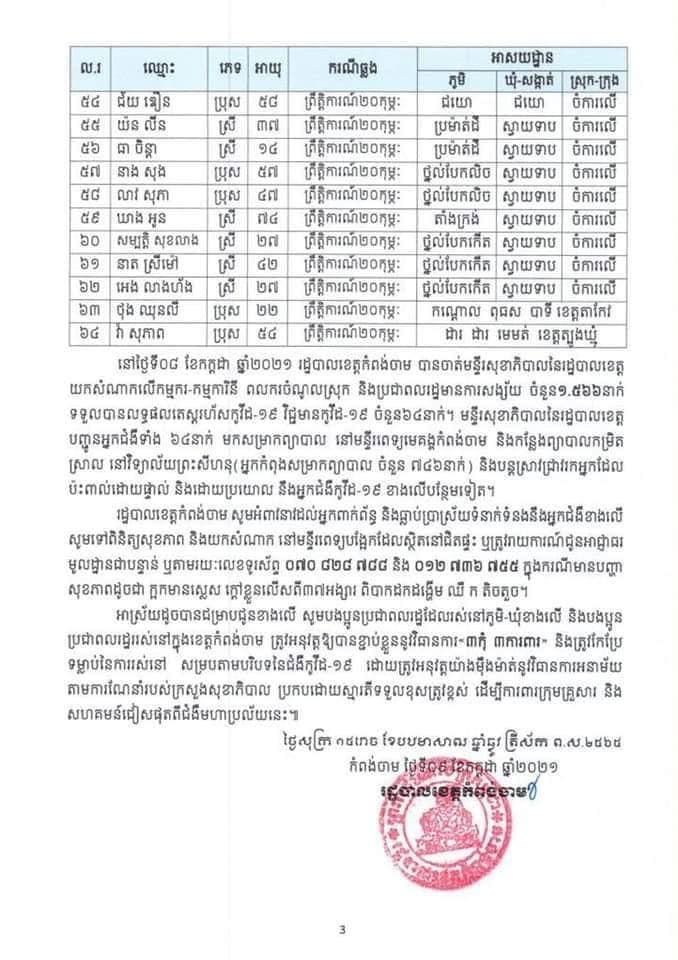 យោងតាមសារលិខិតរបស់ រដ្ឋបាលខេត្តបន្ទាយមានជ័យ និងរដ្ឋបាលខេត្តកំពង់ចាម បានចេញសេចក្ដីប្រកាសព័ត៌មាន ស្ដីពីការរកឃើញអ្នកវិជ្ជមានកូវីដ-១៩ គិតត្រឹមថ្ងៃទី០៩ ខែកក្កដា ឆ្នាំ២០២១នេះ ដោយរដ្ឋបាលខេត្តបន្ទាយមានជ័យ រកឃើញអ្នកវិជ្ជមានកូវីដ-១៩ ចំនួន ៦៤នាក់ និងមានករណីជាសះស្បើយអ្នកជំងឺកូវីដ-១៩ ចំនួន ១១៣នាក់ នៅថ្ងៃទី០៩ ខែកក្កដា ឆ្នាំ២០២១ ចំណែកនៅក្នុងខេត្តកំពង់ចាមវិញ រដ្ឋបាលខេត្តកំពង់ចាម បានរកឃើញវិជ្ជមានកូវីដ-១៩ ចំនួន ៦៤នាក់ ដូចគ្នា ក្នុងនោះរួមមាន៖