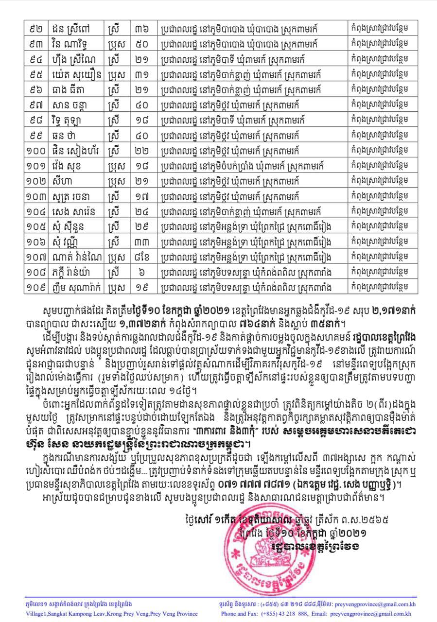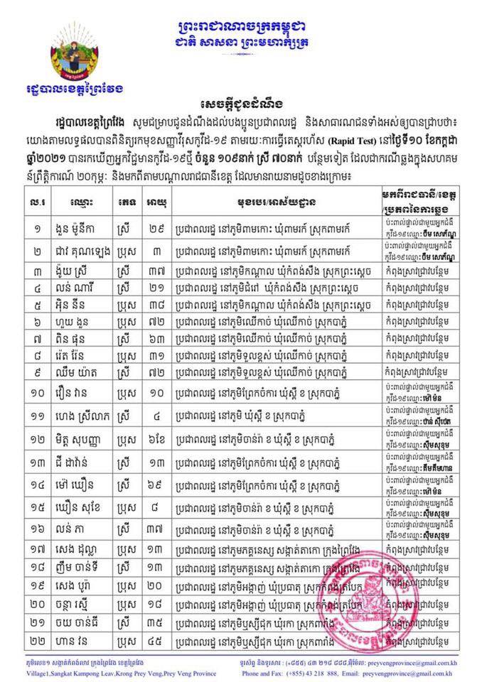 ថ្ងៃទី ១០ ខែកក្កដា ឆ្នាំ២០២១ រដ្ឋបាលខេត្តព្រៃវែង បានរកឃើញ ករណីអ្នកវិជ្ជមានកូវីដ-១៩ ចំនួន១០៩នាក់ បន្ថែមទៀតតាមរយៈការធ្វើតេស្តរហ័ស (Rapid Test) នៅមូលដ្ឋានក្នុងក្រុង/ស្រុកចំនួន១២ ដូចខាងក្រោម: