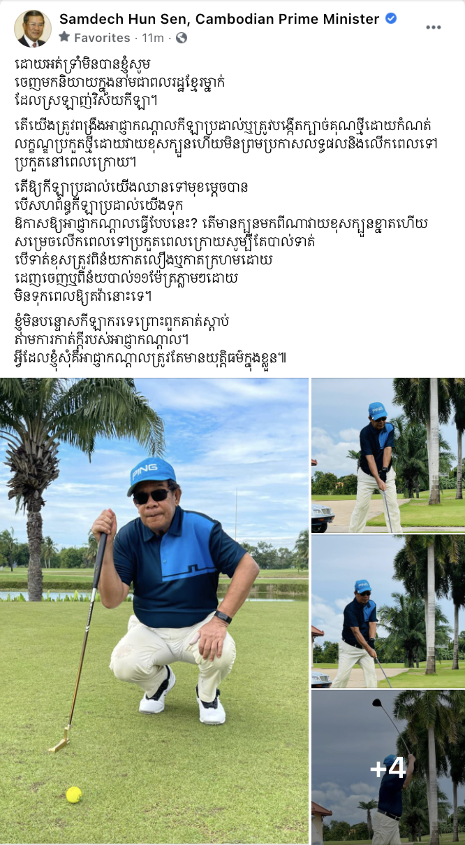 សម្តេចតេជោ បានរៀបរាប់នៅលើទំព័រ Facebook ថា៖ “ដោយអត់ទ្រាំមិនបានខ្ញុំសូម ចេញមកនិយាយក្នុងនាមជាពលរដ្ឋខ្មែរម្នាក់ ដែលស្រឡាញ់វិស័យកីឡា។ តើយើងត្រូវពង្រឹងអាជ្ញាកណ្តាលកីឡាប្រដាល់ឬត្រូវបង្កើតក្បាច់គុណថ្មីដោយកំណត់លក្ខណ្ឌប្រកួតថ្មីដោយវាយខុសក្បួនហើយមិនព្រមប្រកាសលទ្ធផលនិងលើកពេលទៅប្រកួតនៅពេលក្រោយ។ តើឱ្យកីឡាប្រដាល់យើងឈានទៅមុខម្តេចបាន បើសហព័ន្ធកីឡាប្រដាល់យើងទុកឱកាសឱ្យអាជ្ញាកណ្តាលធ្វើបែបនេះ? តើមានក្បួនមកពីណាវាយខុសក្បួនខ្នាតហើយសម្រេចលើកពេលទៅប្រកួតពេលក្រោយសូម្បីតែបាល់ទាត់ បើទាត់ខុសត្រូវពិន័យកាតលឿងឬកាតក្រហមដោយ ដេញចេញឬពិន័យបាល់១១ម៉ែត្រភ្លាមៗដោយ មិនទុកពេលឱ្យតវ៉ានោះទេ។ ខ្ញុំមិនបន្ទោសកីឡាករទេព្រោះពួកគាត់ស្តាប់ តាមការកាត់ក្តីរបស់អាជ្ញាកណ្តាល។ អ្វីដែលខ្ញុំសុំគឺអាជ្ញាកណ្តាលត្រូវតែមានយុត្តិធម៌ក្នុងខ្លួន៕”