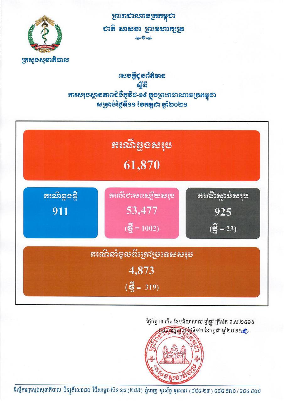 នៅថ្ងៃទី12 ខែកក្កដា ឆ្នាំ2021នេះ ក្រសួងសុខាភិបាលកម្ពុជា បានចេញសេចក្តីជូនដំណឹងពី ការរកឃើញករណីវិជ្ជមានវីរុសកូវីដ១៩ថ្មី ចំនួន 911នាក់ ខណៈអ្នកបានជាសះស្បើយថ្មីមានចំនួន 1002នាក់ និងមានអ្នកបាត់បង់ជីវិត23នាក់។ គិតមកទល់ពេលនេះ ករណីឆ្លងកូវីដ១៩ សរុបនៅក្នុងប្រទេសកម្ពុជា មានចំនួន 61,870នាក់, ករណីជាសះស្បើយសរុប 53,477នាក់ និងស្លាប់សរុប 925នាក់៕