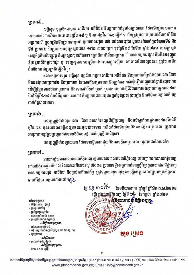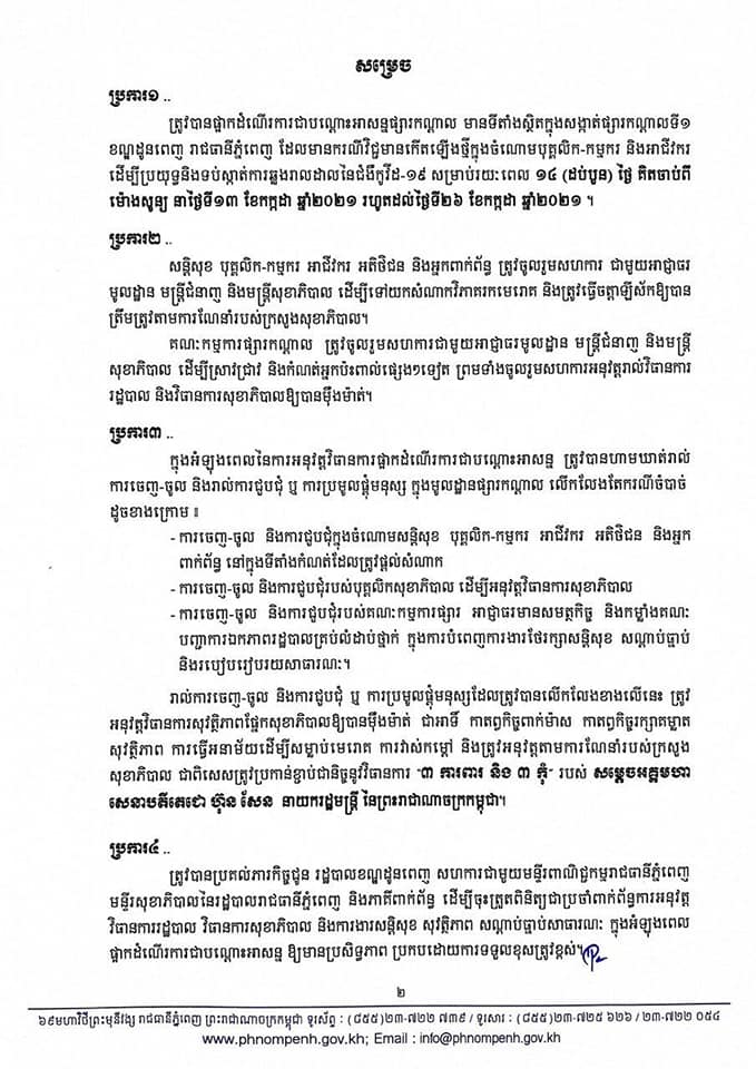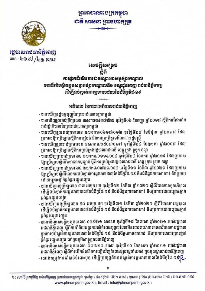 យោងតាមការបញ្ជាក់ពី រដ្ឋបាលរាជធានីភ្នំពេញ បានចេញសេចក្ដីសម្រេច ស្ដីពីការផ្អាកដំណើរការជាបណ្ដោះអាសន្នផ្សារកណ្ដាល មានទីតាំងស្ថិតក្នុងសង្កាត់ផ្សារកណ្ដាលទី១ ខណ្ឌដូនពេញ រាជធានីភ្នំពេញ ដែលមានករណីវិជ្ជមានកើតឡើងថ្មីក្នុងចំណោមបុគ្គលិក-កម្មករ និងអាជីវករ ដើម្បីប្រយុទ្ធ និងទប់ស្កាត់ការឆ្លងរីករាលដាលនៃជំងឺកូវីដ-១៩ សម្រាប់រយៈពេល ១៤ថ្ងៃ គិតចាប់ពីម៉ោងសូន្យ នាថ្ងៃទី១៣ ខែកក្កដា ឆ្នាំ២០២១ រហូតដល់ថ្ងៃទី២៦ ខែកក្កដា ឆ្នាំ២០២១៕