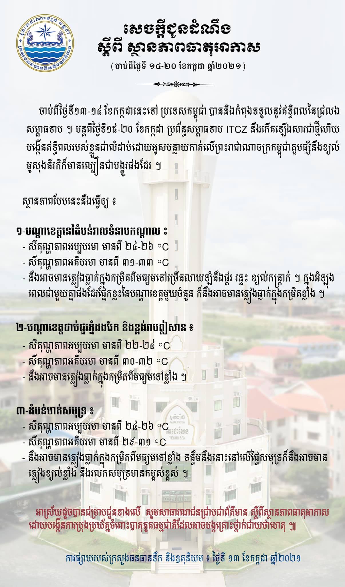 យោងតាមការបញ្ជាក់ពីក្រសួងធនធានទឹក និងឧតុនិយម បានឲ្យដឹងថា ចាប់ពីថ្ងៃទី១៣ ដល់ថ្ងៃទី១៤ ខែកក្កដា នេះទៅ ប្រទេសកម្ពុជា បាននិងកំពុងទទួលនូវឥទ្ធិពលនៃជ្រលងសម្ពាធទាប។ បន្តពីថ្ងៃទី១៥-២០ ខែកក្កដា ប្រព័ន្ធសម្ពាធទាប ITCZ នឹងកើតឡើងសារជាថ្មីហើយបង្កើនឥទ្ធិពលរបស់ខ្លួនជាលំដាប់ ដោយអូសបន្លាយកាត់លើព្រះរាជាណាចក្រកម្ពុជាគួបផ្សំនឹងខ្យល់មូសុងនិរតីក៏មានល្បឿនជាបង្គួរផងដែរ។ ស្ថានភាពបែបនេះនឹងធ្វើឲ្យ៖