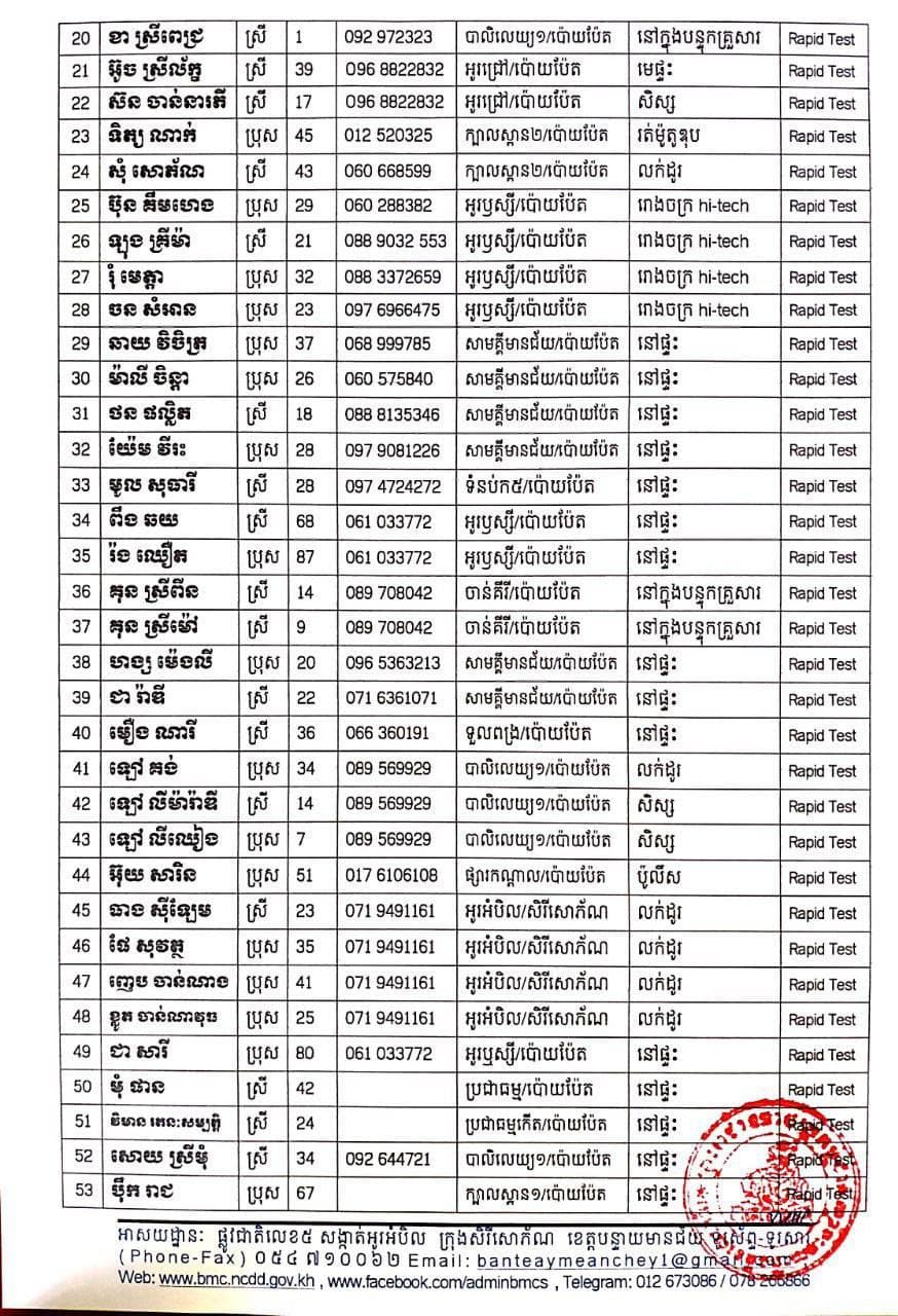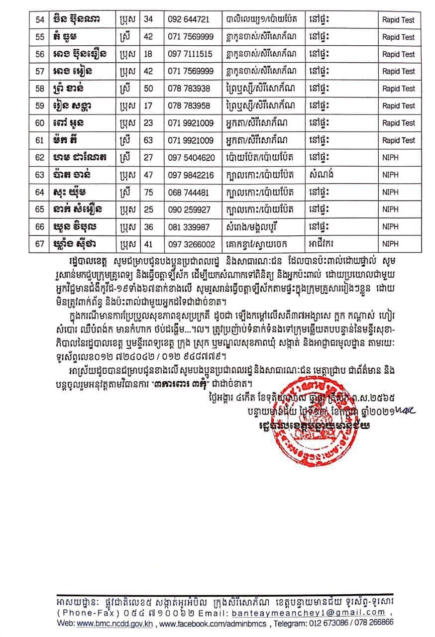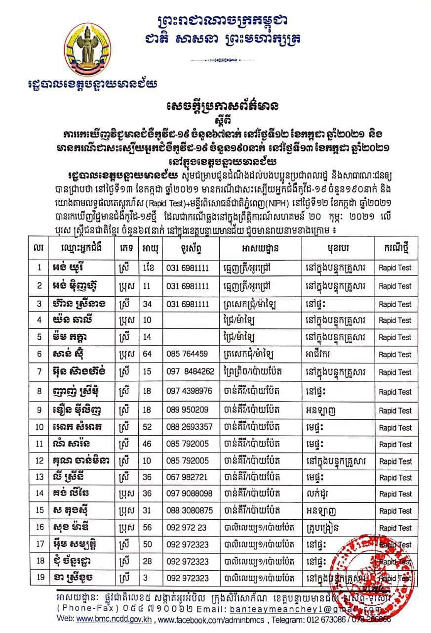 ខេត្តបន្ទាយមានជ័យ៖ យោងតាមការចុះផ្សាយរបស់ រដ្ឋបាលខេត្តបន្ទាយមានជ័យ សូមជម្រាបជូនដំណឹងបងប្អូនប្រជាពលរដ្ឋ និងសាធារណជនឲ្យបានជ្រាបថា៖ នៅថ្ងៃទី១៣ ខែកក្កដា ឆ្នាំ២០២១ មានករណីជាសះស្បើយអ្នកជំងឺកូវីដ-១៩ ចំនួន ១៩០នាក់ និងយោងតាមលទ្ធផលតេស្តរហ័ស មន្ទីរពិសោធន៍ជាតិភ្នំពេញ(NIPH) នៅថ្ងៃទី១២ ខែកក្កដា ឆ្នាំ២០២១ បានរកឃើញវិជ្ជមានជំងឺកូវីដ-១៩ថ្មី ដែលជាករណីឆ្លងនៅក្នុងព្រឹត្តិការណ៍សហគមន៍ ២០ កុម្ភៈ ២០២១ លើបុរស ស្រ្តីជនជាតិខ្មែរ ចំនួន ៦៧នាក់ នៅក្នុងខេត្តបន្ទាយមានជ័យ ដូចមានរាយនាមខាងក្រោម៖