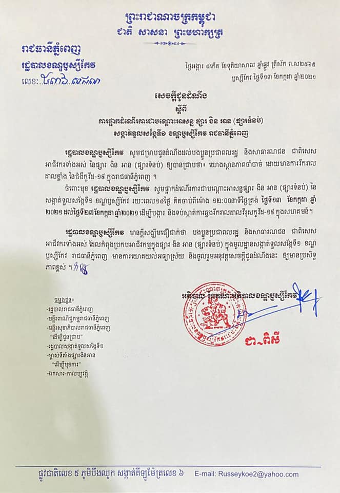 រដ្ឋបាលខណ្ឌឬស្សីកែវ សម្រេចផ្អាកដំណើរការជាបណ្តោះអាសន្នផ្សារ ងិន អាន (ផ្សារទំនប់) នៃសង្កាត់ទួលសង្កែទី១ ខណ្ឌឬស្សីកែវ រយៈពេល១៤ថ្ងៃ គិតចាប់ពីម៉ោង ១២ និង០០នាទីថ្ងៃត្រង់ ថ្ងៃទី១៣ ខែកក្កដា ឆ្នាំ២០២១ ដល់ថ្ងៃទី២៧ ខែកក្កដា ឆ្នាំ២០២១ ដើម្បីបង្ការ និងទប់ស្កាត់ការឆ្លងរីករាលដាលវីរុសកូវីដ១៩ ក្នុងសហគមន៍៕