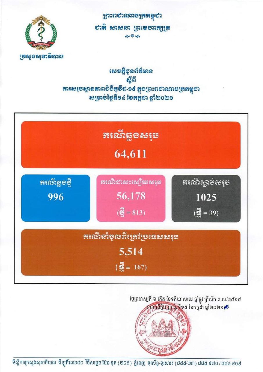 នៅថ្ងៃទី15 ខែកក្កដា ឆ្នាំ2021នេះ ក្រសួងសុខាភិបាលកម្ពុជា បានចេញសេចក្តីជូនដំណឹងពី ការរកឃើញករណីវិជ្ជមានវីរុសកូវីដ១៩ថ្មី ចំនួន 996នាក់ ខណៈអ្នកបានជាសះស្បើយថ្មីមានចំនួន 813នាក់ និងមានអ្នកបាត់បង់ជីវិត39នាក់។ គិតមកទល់ពេលនេះ ករណីឆ្លងកូវីដ១៩ សរុបនៅក្នុងប្រទេសកម្ពុជា មានចំនួន 64,611នាក់, ករណីជាសះស្បើយសរុប 56,178នាក់ និងស្លាប់សរុប 1,025នាក់៕