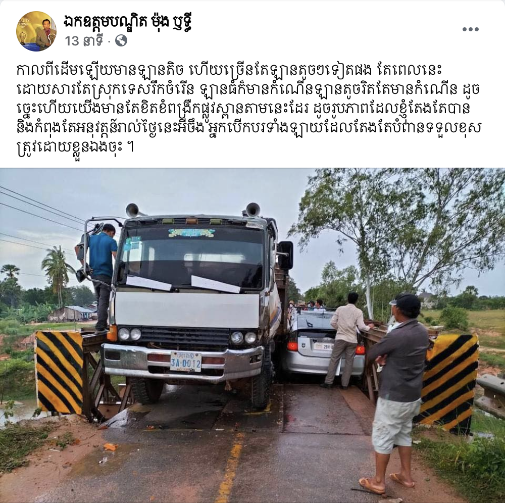 រូបភាពនៃគ្រោះថ្នាក់ចរាចរណ៍មួយបានកើតឡើងនៅលើស្ពានតូចមួយ ដែលបង្ករអោយមានការខូចខាតរថយន្តចំនួន២គ្រឿង គឺរថយន្ត Toyota Prius និងរថយន្តធុនធំមួយគ្រឿងទៀត តែមិនបណ្តាលអោយមានអ្នករងរបួសនោះឡើយ។ ក្នុងនោះដែរ ឯកឧត្តមបណ្ឌិត ម៉ុង ឫទ្ធី ដែលគេស្គាល់ថាជាសេដ្ឋីកសិកម្មនៅកម្ពុជា បានបង្ហោះសារមួយឃ្លាជុំវិញករណីគ្រោះថ្នាក់ចរាចរណ៍នោះថា៖