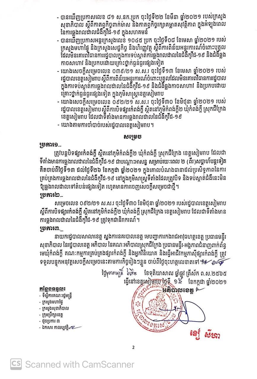ខេត្តសៀមរាប៖ យោងតាមការចុះផ្សាយរបស់ រដ្ឋបាលខេត្តសៀមរាប នៅថ្ងៃទី១៥ ខែកក្កដា ឆ្នាំ២០២១ បានចេញសេចក្ដី សម្រេចបន្តបិទផ្សារដំដែក និងផ្សារកំពង់ក្ដី ដែលជាទីតាំងមានការឆ្លងរាលដាលនៃជំងឺកូវីដ-១៩ ជាបណ្ដោះអាសន្ន សម្រាប់រយៈពេល ២សប្តាហ៍បន្តទៀត។