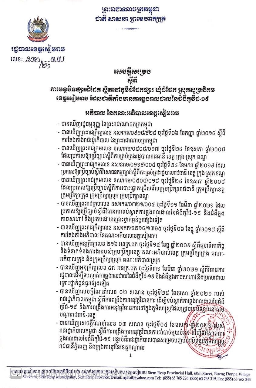 រដ្ឋបាលខេត្តសៀមរាប បានបញ្ជាក់ថា បន្តផ្អាកបិទផ្សារដំដែក ស្ថិតក្នុងភូមិដំដែកផ្សារ ឃុំដំដែក ស្រុកសូទ្រនិគម ក្នុងរយៈពេល១៤ថ្ងែ ចាប់ពីថ្ងៃទី១៥ ដល់ថ្ងៃទី២៨ ខែកក្កដា ឆ្នាំ២០២១ និងសម្រេចបន្តបិទផ្សារកំពង់ក្ដី ស្ថិតក្នុងភូមិកំពង់ក្ដី២ ឃុំកំពង់ក្ដី ស្រុកជីក្រែង រយៈពេល១៤ថ្ងែដូចគ្នា ចាប់ពីថ្ងៃទី១៣ ដល់ថ្ងៃទី២៦ ខែកក្កដា ឆ្នាំ២០២១ ក្នុងគោលបំណងធានាដល់ប្រសិទ្ធភាពនៃការគ្រប់គ្រងការឆ្លងរាលដាលនៃជំងឺកូវីដ-១៩ នៅក្នុងភូមិសាស្ត្រទីតាំង ដែលត្រូវបិទ និងទប់ស្កាត់ជំងឺនេះ មិនឲ្យឆ្លងរាលដាលទៅតំបន់ផ្សេងទៀត រហូតដល់មានការចេញសម្រេចជាថ្មី ៕