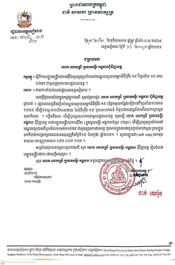 កាលពីថ្ងៃទី១៤ ខែកក្កដា ឆ្នាំ២០២១ ម្សិលមិញនេះ រដ្ឋបាលខេត្តសៀមរាប បានចេញលិខិតផ្លូវការមួយដល់បណ្ដាមន្ទីរ អង្គភាពជុំវិញខេត្ត ដើម្បីចូលរួមសហការណ៍ជាមួយរដ្ឋបាលខេត្ត ក្នុងការចាត់បញ្ជូនមន្ត្រី ដើម្បីចូលរួមប្រចាំការ នៅមណ្ឌលព្យាបាលវិទ្យាល័យ ១០មករា១៩៧៩ ជាកន្លែង សម្រាប់ព្យាបាលអ្នកជំងឺកូវីដ-១៩ ។