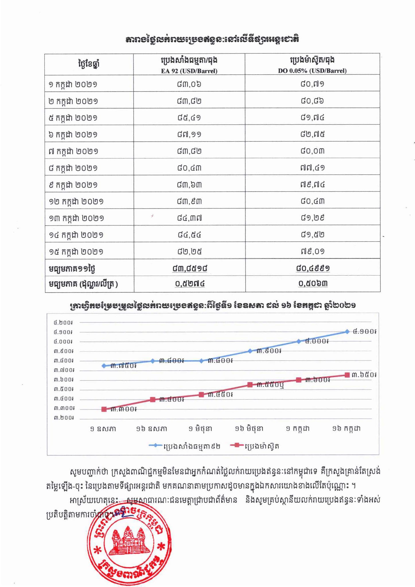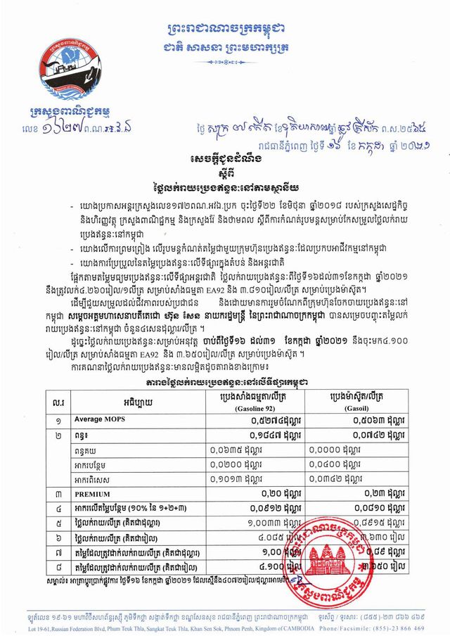 រាជធានីភ្នំពេញ៖ យោងតាមលិខិតរបស់ក្រសួងពាណិជ្ជកម្ម ចុះផ្សាយថ្ងៃទី១៦ ខែកក្កដា ឆ្នាំ២០២១ ស្តីអំពីតម្លៃលក់រាយប្រេងឥន្ធនៈនៅតាមស្ថានីយទាំងអស់ក្នុងព្រះរាជាណាចក្រកម្ពុជាសម្រាប់អនុវត្តទៅតាមតម្លៃមធ្យមប្រេងឥន្ធនៈលើទីផ្សារអន្តរជាតិ ចាប់ពីថ្ងៃទី១៦ ដល់ថ្ងៃទី៣១ ខែកក្កដា ឆ្នាំ២០២១ បានឲ្យដឹងថា តម្លៃប្រេងសាំងធម្មតាមានតម្លៃ ៤,១០០រៀលក្នុងមួយលីត្រ ចំណែកឯប្រេងសាំងម៉ាស៊ូតមានតម្លៃ ៣,៦៥០រៀលក្នុងមួយលីត្រប៉ុណ្ណោះ។