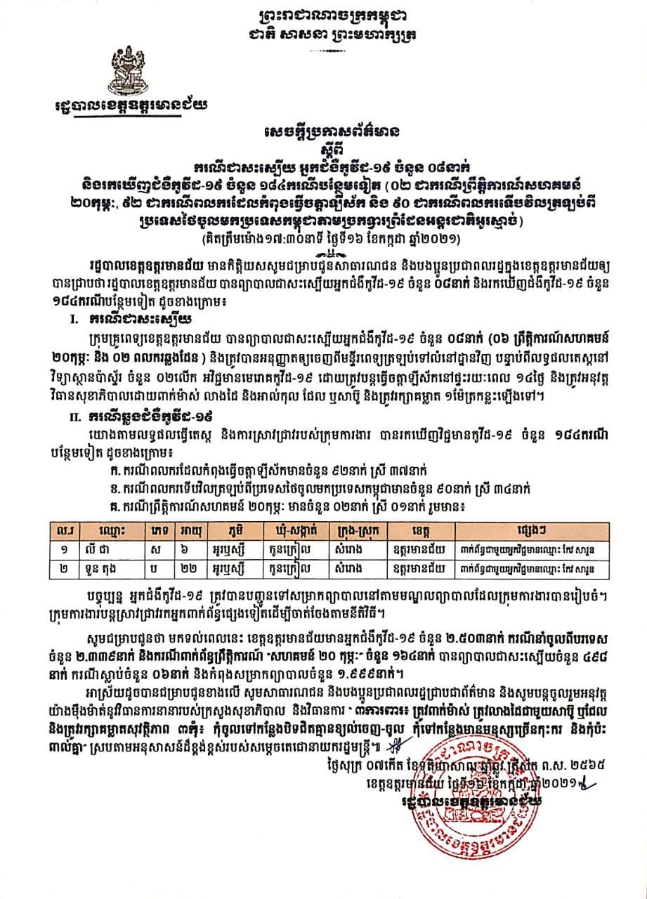 ខេត្តឧត្តរមានជ័យរកឃើញអ្នកវិជ្ជមានកូវិដ១៩ចំនួន ១៨៤ នាក់ ក្នុងនោះ១៨២នាក់ជាករណីនាំចូលពីប្រទេសថៃ និង២នាក់ជាករណីឆ្លងក្នុងសហគមន៍