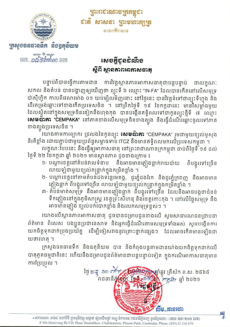 យោងតាមការព្យាករជ្រលងនៃកូនព្យុះ សេមប៉ាកា “CEMPAKA” រួមជាមួយខ្យល់មូសុងនិរតីខ្លាំង ដោយភ្ជាប់ជាមួយប្រព័ន្ធសម្ពាធទាប់ ITCZ នឹងមានឥទ្ធិពលមកលើប្រទេសកម្ពុជា។