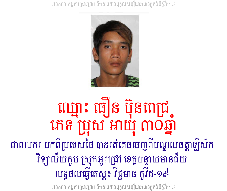 សូមតាមដាន សុខភាព របស់ខ្លួន ឬ ប្រសិនបើមានអាការៈ គ្រុនក្ដៅ, ក្អក, កណ្ដាស់, ឈឺបំពង់ក ឬដកដង្ហើមខ្លីៗ ឬ សង្ស័យ សូមប្រញាប់ទៅធ្វើតេស្ដ។ សូមរាយការណ៍ទៅអាជ្ញាធរមូលដ្ឋាន ប្រសិនបើដឹងពីដំណើរ របស់បុគ្គលខាងលើ ឬ អ្នកដែលបានពាក់ព័ន្ធ ជាមួយបុគ្គលខាងលើនេះ ដោយមូលហេតុ៖ ឈ្មោះ ធឿន ប៊ុនពេជ្រ គឺជាពលករមកពីប្រទេសថៃ ត្រូវបានធ្វើតេស្ដរកឃើញវិជ្ជមាន មេរោគ កូវីដ១៩ (មិនទាន់ត្រូវបានបញ្ជាក់ថា ជាមេរោគប្រភេទថ្មី #Delta នៅឡើយ)។ មុនពេលចេញលទ្ធផល បុគ្គលខាងលើ បានរត់គេចចេញពីមណ្ឌលចត្តាឡីស័ក កាលថ្ងៃទី១៦ ខែកក្កដា ឆ្នាំ២០២១។ សូមអរគុណ!